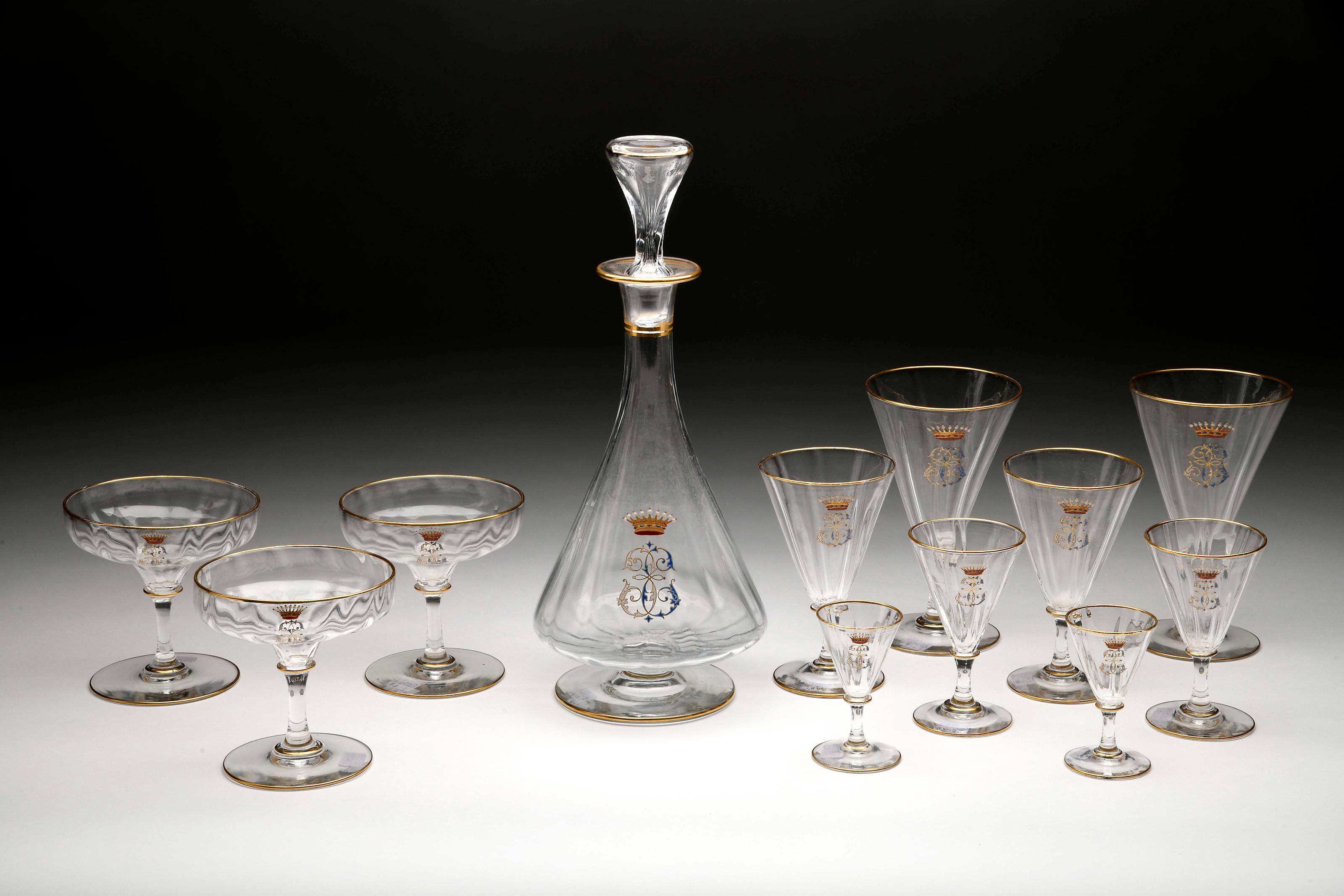 Peças de serviço de copos cristal composto por garrafa com tampa, 2 copos de água, 2 copos de vinho tinto, 2 copos de vinho branco, 2 cálices de vinho do Porto, 3 taças de champanhe, decoração policromada e dourada com monograma "EE" encimado por coronel de conde - Elise Hensler (1836-1929), Condessa de Edla Europeias séc. XIX (2ª metade) desgaste na decoração Dimensões (altura x comprimento x largura) - (garrafa) 31,5 cm
