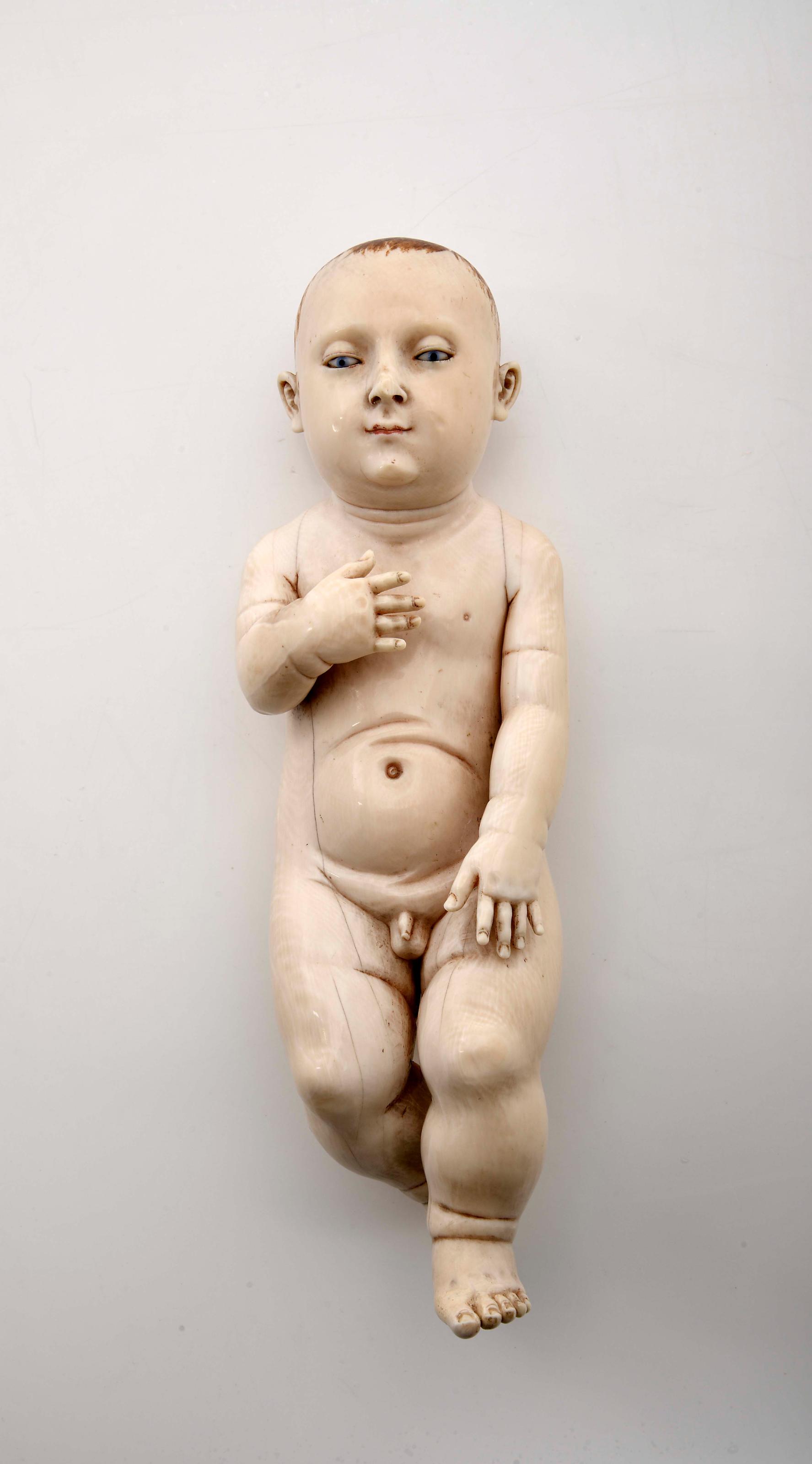 Menino Jesus deitado escultura em marfim parcialmente policromada olhos acentuados por matéria vítrea Hispano-Filipina séc. XVII algum desgaste na decoração Dimensões (altura x comprimento x largura) - 21,5 cm Notas: vd. MARCOS, Margarita Mercedes Estella - "Marfiles de las Províncias Ultramarinas e Orientales de España y Portugal". México: Espejo de Obsidiana, 2010, 2ª Edição, pp. 94, 96 e 98, nºs 27, 32 e 35; e catálogo da exposição "A Expansão Portuguesa e a Arte do Marfim". Lisboa: Fundação Calouste Gulbenkian, 1991, p. 91, nºs 219 onde se refere ser da vertente Namban (nipo-portuguesa) identificação que a mais recente investigação coloca em causa.a) Este lote está sujeito às restrições CITES de exportação/importação e encontra-se devidamente certificado: nº IT/CE/2023/MI/00182;b) É actualmente proibida por diversos países a importação de bens que incorporem materiais de espécies da fauna e flora selvagens protegidas, incluindo, entre outros, marfim, coral e tartaruga;c) Em Portugal, em conformidade com a prevista transposição para a legislação nacional das mais recentes orientações da UE relativas ao comércio de marfim, está suspensa a emissão de certificados de reexportação para países que não integrem a UE;d) Neste contexto, aconselham-se os seus potenciais compradores a informarem-se previamente sobre a legislação do seu país e restrições internacionais aplicáveis.