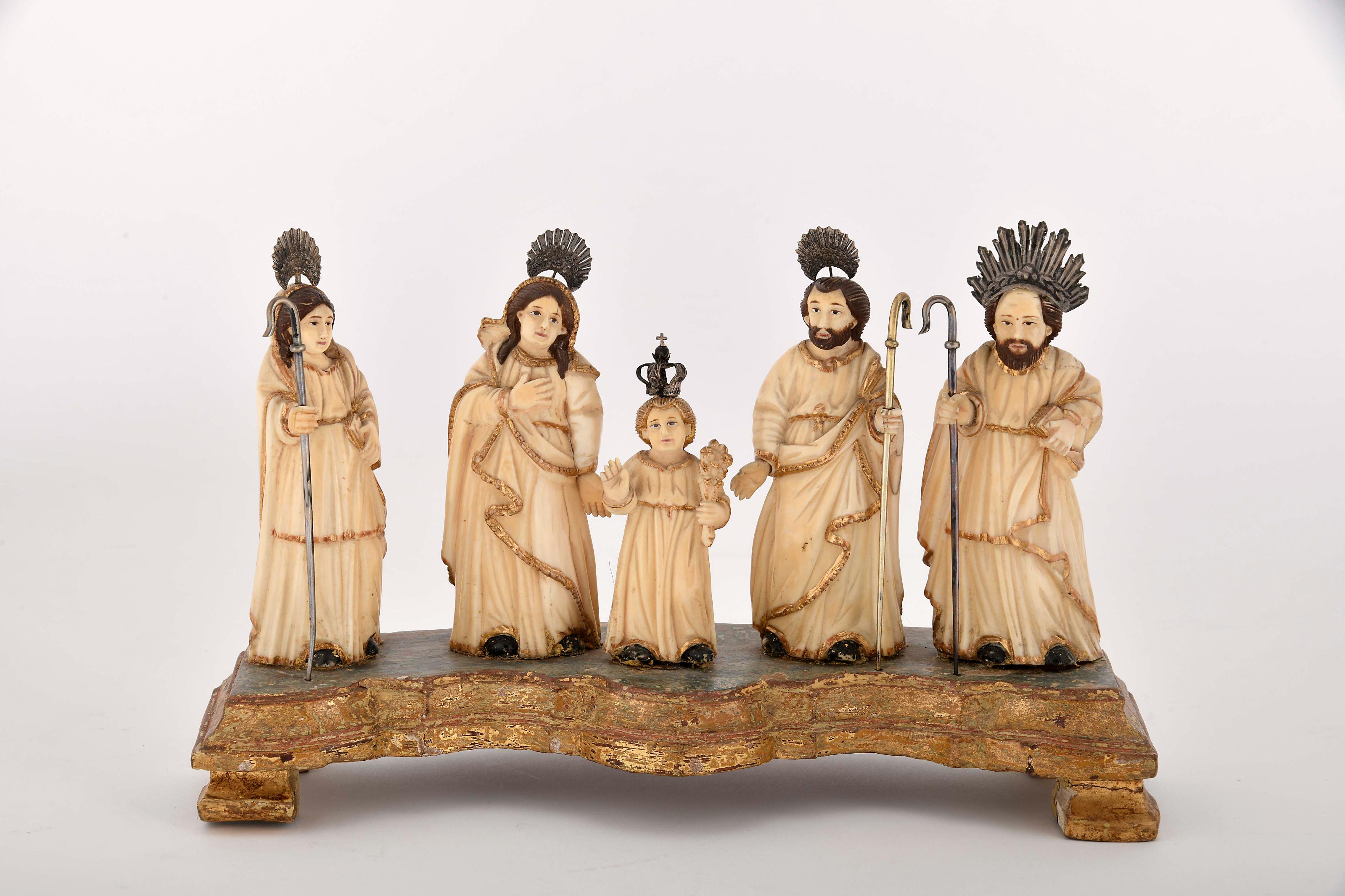 Santa Parentela Lusíada cinco esculturas em marfim parcialmente pintado e dourado coroa, resplendores e báculos em prata vertente Indo-Portuguesa séc. XVIII base em madeira dourada pratas sem marcas, ao abrigo do Decreto-Lei nº 120/2017, de 15 de Setembro - art. 2º, nº 2, alínea c) Dimensões (altura x comprimento x largura) - (São José) 10,5 cm Notas: vd. exemplar semelhante no catálogo da exposição "A Expansão Portuguesa e a Arte do Marfim". Lisboa: Fundação Calouste Gulbenkian, 1991, p. 70, nº 141.a) Este lote está sujeito às restrições CITES de exportação/importação e encontra-se devidamente certificado: nº 16-PT-LX01238/C;b) É actualmente proibida por diversos países a importação de bens que incorporem materiais de espécies da fauna e flora selvagens protegidas, incluindo, entre outros, marfim, coral e tartaruga;c) Em Portugal, em conformidade com a prevista transposição para a legislação nacional das mais recentes orientações da UE relativas ao comércio de marfim, está suspensa a emissão de certificados de reexportação para países que não integrem a UE;d) Neste contexto, aconselham-se os seus potenciais compradores a informarem-se previamente sobre a legislação do seu país e restrições internacionais aplicáveis.