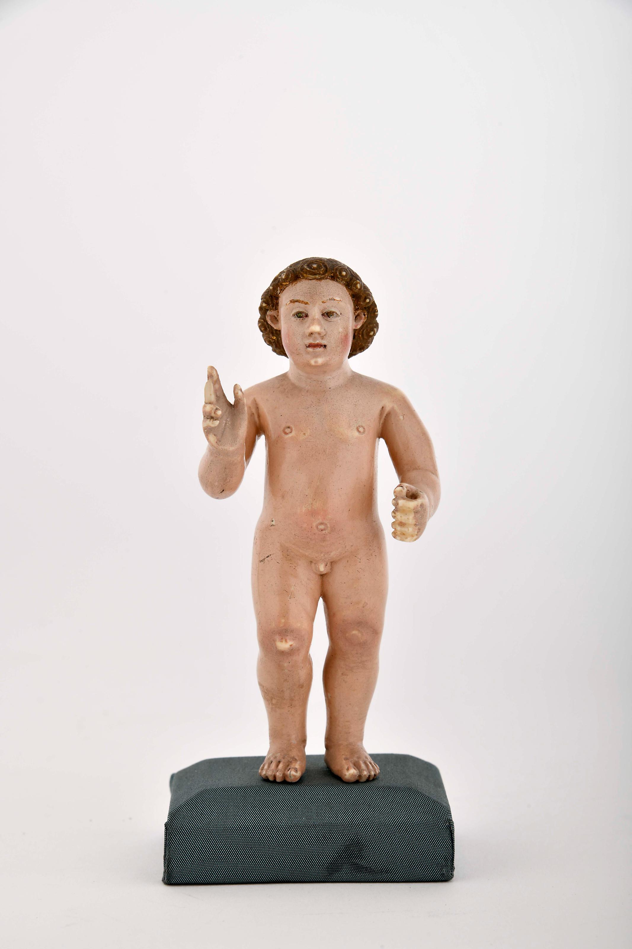 Menino Jesus Salvador do Mundo Lusíada escultura em marfim policromado vertente Indo-Portuguesa séc. XVII (2ª metade) falta de um dedo, ligeiro desgaste na decoração, base não original Dimensões (altura x comprimento x largura) - (marfim) 11 cm Notas: vd. exemplares semelhantes no catálogo da exposição "Arte do Marfim". Porto: Museu dos Transportes e Comunicações, 1998, p. 42, nºs 54-59.a) Este lote está sujeito às restrições CITES de exportação/importação e encontra-se devidamente certificado: nº 12-PT-LX4024/C;b) É actualmente proibida por diversos países a importação de bens que incorporem materiais de espécies da fauna e flora selvagens protegidas, incluindo, entre outros, marfim, coral e tartaruga;c) Em Portugal, em conformidade com a prevista transposição para a legislação nacional das mais recentes orientações da UE relativas ao comércio de marfim, está suspensa a emissão de certificados de reexportação para países que não integrem a UE;d) Neste contexto, aconselham-se os seus potenciais compradores a informarem-se previamente sobre a legislação do seu país e restrições internacionais aplicáveis.