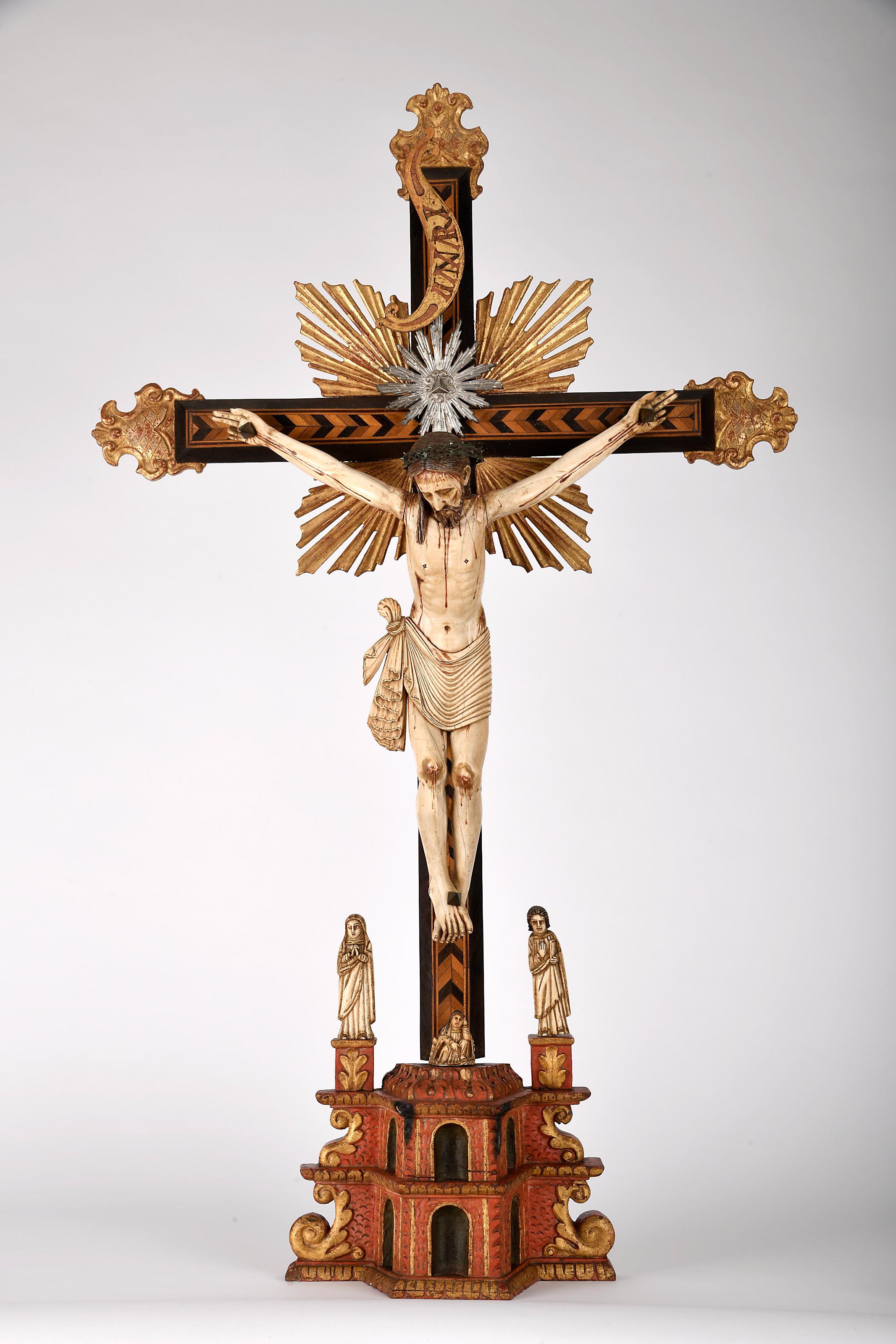 Cristo crucificado Lusíada escultura de grandes dimensões em marfim parcialmente pintado vertente Cíngalo-Portuguesa séc. XVI/XVII integrado em Calvário com mais três esculturas em marfim parcialmente pintado e dourado "Nossa Senhora", "São João" e "Santa Maria Madalena", vertente indo-portuguesa, séc. XVII, cruz faixeada a pau-santo com marchetaria de pau-santo, espinheiro e buxo com resplendor e extremidades em madeira entalhada e dourada, base em madeira entalhada, pintada de vermelho e dourada com diversos nichos, listel com «Titulus Crucis» em madeira recortada, pintada e dourada, resplendor em prata relevada, coroa de espinhos em metal, pequenas faltas e defeitos prata sem marcas, ao abrigo do Decreto-Lei nº 120/2017, de 15 de Setembro - art. 2º, nº 2, alínea c) Dimensões (altura x comprimento x largura) - (Cristo) 48 cm; (total) 116,5 cm Notas: vd. exemplares semelhantes no catálogo da exposição "A Expansão Portuguesa e a Arte do Marfim". Lisboa: Fundação Calouste Gulbenkian, 1991, pp. 144, 146-147, 149-150 e 152, nºs 390, 396, 400, 406, 407, 410, 413 e 421. a) Este lote está sujeito às restrições CITES de exportação/importação e encontra-se devidamente certificado: nº 25PTLX04536C;b) É actualmente proibida por diversos países a importação de bens que incorporem materiais de espécies da fauna e flora selvagens protegidas, incluindo, entre outros, marfim, coral e tartaruga;c) Em Portugal, em conformidade com a prevista transposição para a legislação nacional das mais recentes orientações da UE relativas ao comércio de marfim, está suspensa a emissão de certificados de reexportação para países que não integrem a UE;d) Neste contexto, aconselham-se os seus potenciais compradores a informarem-se previamente sobre a legislação do seu país e restrições internacionais aplicáveis.