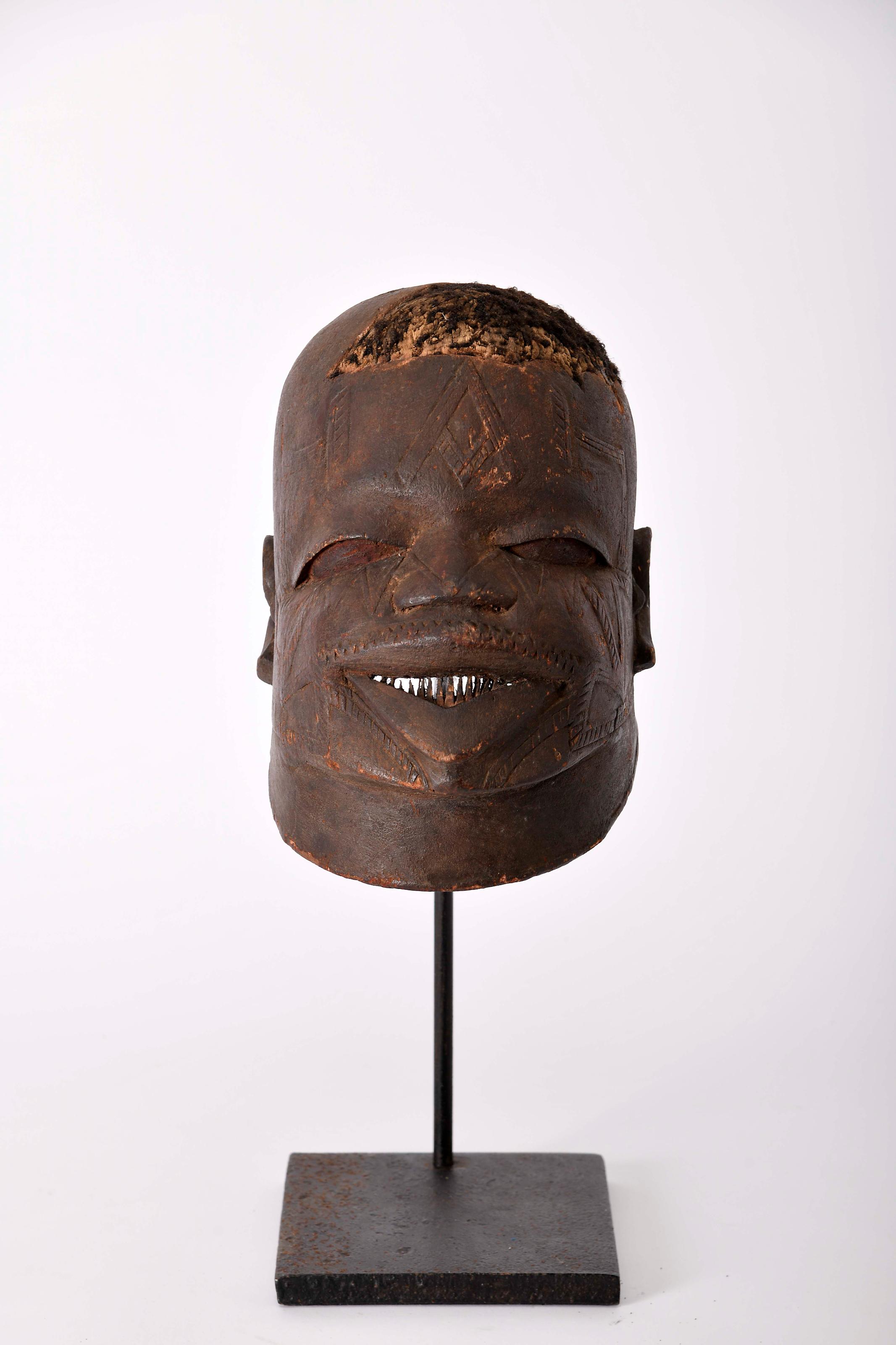 Máscara Lipiko madeira leve esculpida, sulcada e patinada com vestígios de pintura cabelo humano Moçambicana - Maconde séc. XX (anos 40/50) falta de cabelo, pequenas faltas e defeitos, suporte moderno em ferro Dimensões (altura x comprimento x largura) - 27 cm