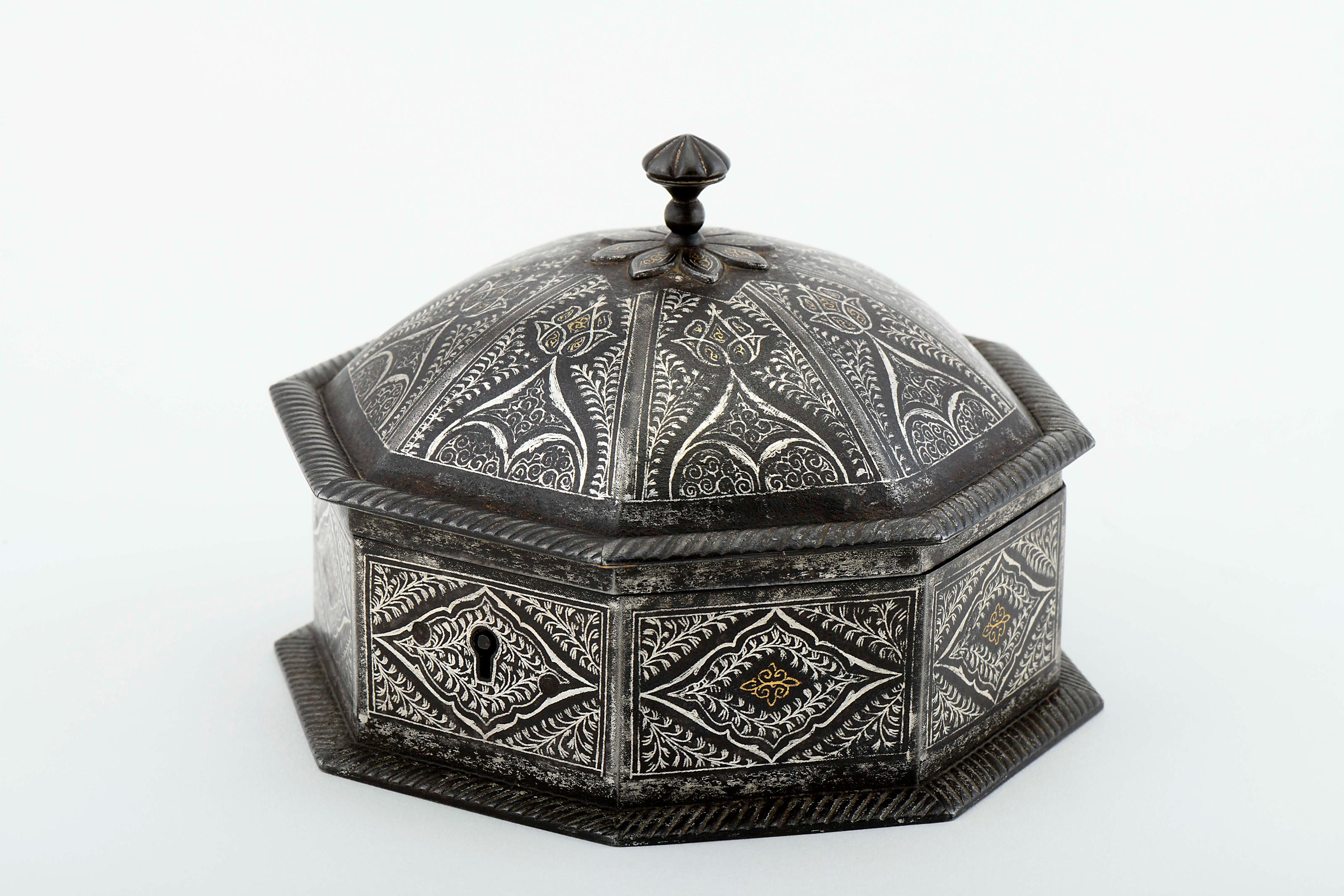 Cofre octogonal ferro decoração damasquinada a prata e metal dourado, frisos gomados, pomo da tampa relevado "Botão de flor de oito pétalas" Índia Mogol séc. XVIII/XIX sinais de uso Dimensões (altura x comprimento x largura) - 9,2 x 13 x 13 cm
