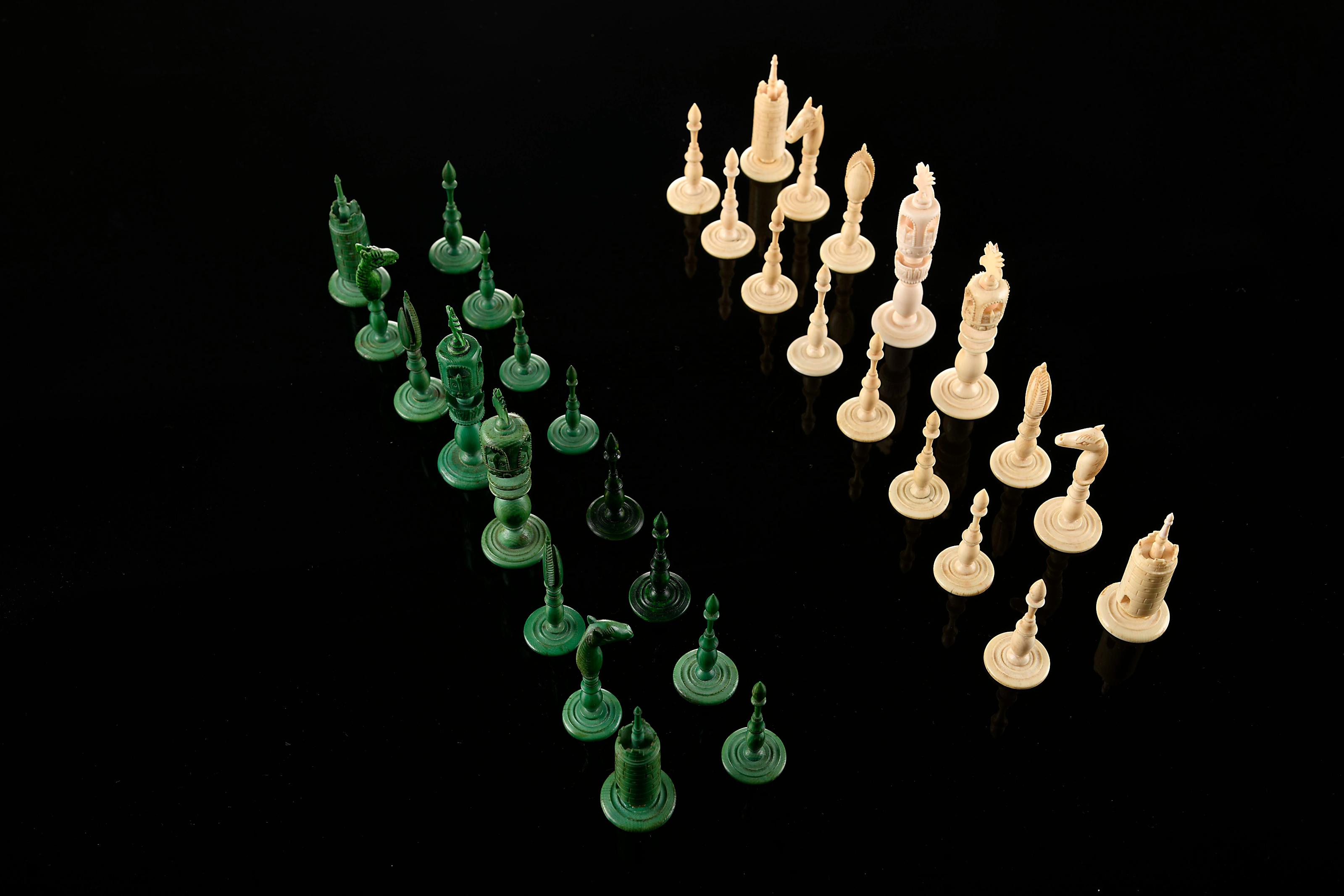Jogo de Xadrez «Burmese» marfim um dos conjuntos tingido de verde Chinês séc. XIX pequenos restauros Dimensões (altura x comprimento x largura) - (Rei) 8,5 cm Notas: a) Este lote está sujeito às restrições CITES de exportação/importação e encontra-se devidamente certificado: nº 25PTLX04961C;b) É actualmente proibida por diversos países a importação de bens que incorporem materiais de espécies da fauna e flora selvagens protegidas, incluindo, entre outros, marfim, coral e tartaruga;c) Em Portugal, em conformidade com a prevista transposição para a legislação nacional das mais recentes orientações da UE relativas ao comércio de marfim, está suspensa a emissão de certificados de reexportação para países que não integrem a UE;d) Neste contexto, aconselham-se os seus potenciais compradores a informarem-se previamente sobre a legislação do seu país e restrições internacionais aplicáveis.