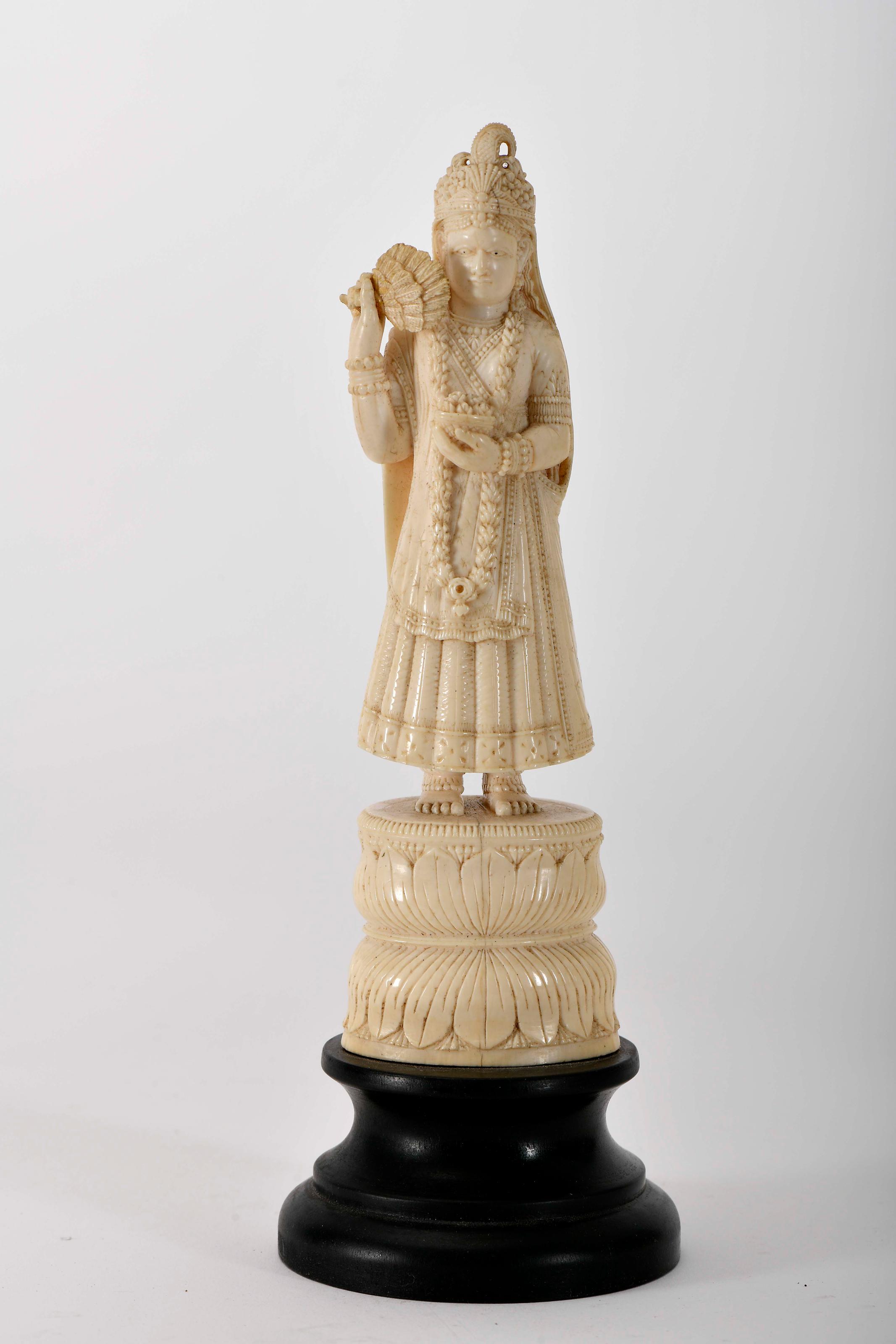 Figura feminina indiana em traje de cerimónia escultura em marfim sobre base em marfim esculpido "Folhas" Indiana séc. XVIII colagem no leque, base posterior em madeira Dimensões (altura x comprimento x largura) - (marfim) 21 cm Notas: a) Este lote está sujeito às restrições CITES de exportação/importação e encontra-se devidamente certificado: nº 23PTLX05306C;b) É actualmente proibida por diversos países a importação de bens que incorporem materiais de espécies da fauna e flora selvagens protegidas, incluindo, entre outros, marfim, coral e tartaruga;c) Em Portugal, em conformidade com a prevista transposição para a legislação nacional das mais recentes orientações da UE relativas ao comércio de marfim, está suspensa a emissão de certificados de reexportação para países que não integrem a UE;d) Neste contexto, aconselham-se os seus potenciais compradores a informarem-se previamente sobre a legislação do seu país e restrições internacionais aplicáveis.