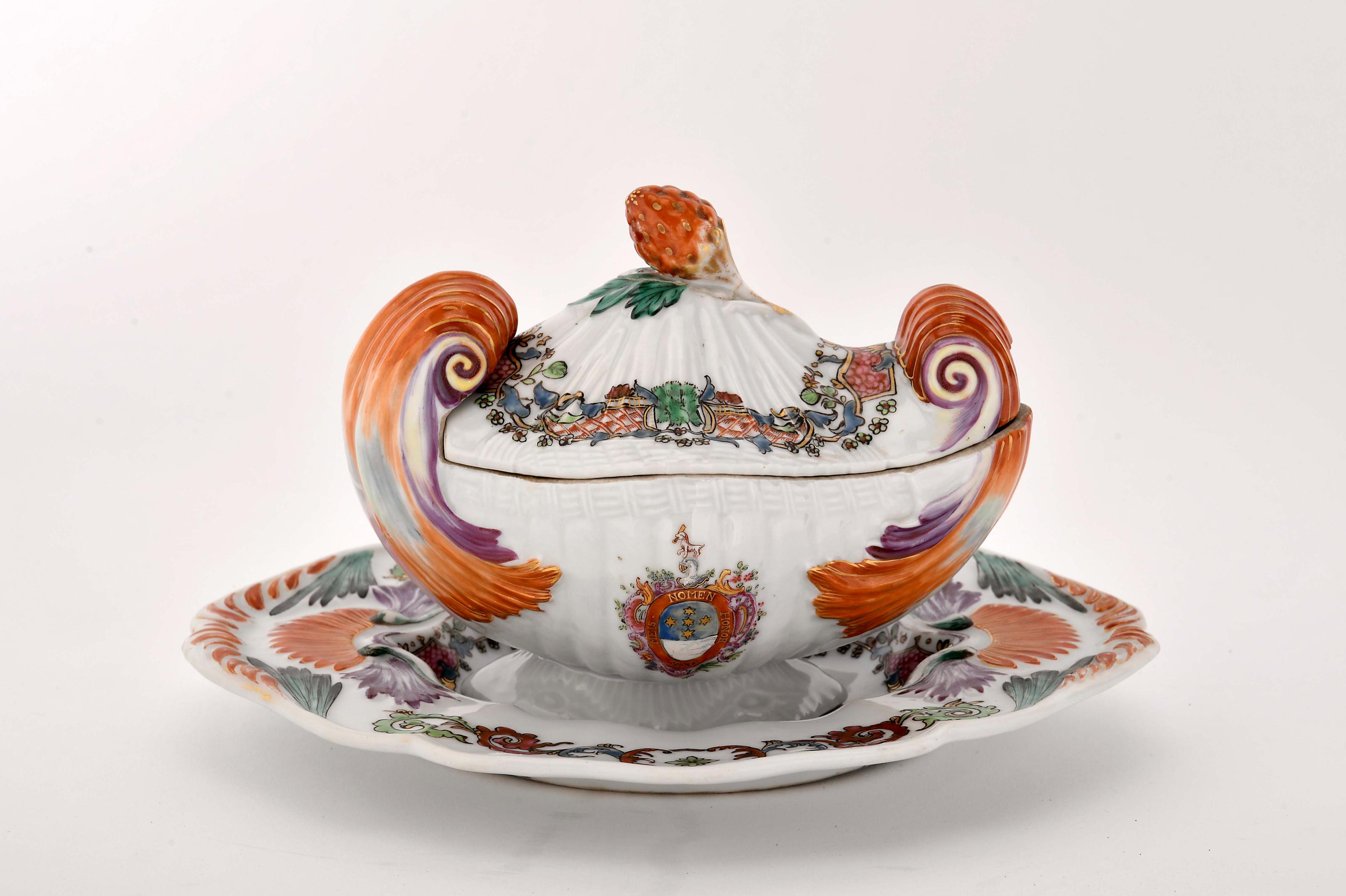 Terrina-molheira com travessa rocaille porcelana Chinesa de exportação decoração policromada e dourada com armas de Joaquim Inácio da Cruz Sobral - 3º serviço (silvados) reinado Qianlong (1736-1795) pomo da tampa com colagem Dimensões (altura x comprimento x largura) - (terrina/molheira) 12 x 15 x 11 cm; (travessa) 2,5 x 23 x 18 cm Notas: vd. CASTRO, Nuno de - "A Porcelana Chinesa ao Tempo do Império - Portugal/Brasil". Lisboa: ACD Editores, 2007, p. 170; SANTOS, A. Varela - "Portugal na Porcelana da China - 500 Anos de Comércio", volume IV. Lisboa: Artemágica, 2010, pp. 1091-1093, onde um exemplar semelhante de encontra representado; e e DIAS, Pedro – “Heráldica Portuguesa na Porcelana da China Qing”. Lisboa: Fundação Macau, 2014, pp. 192-205.