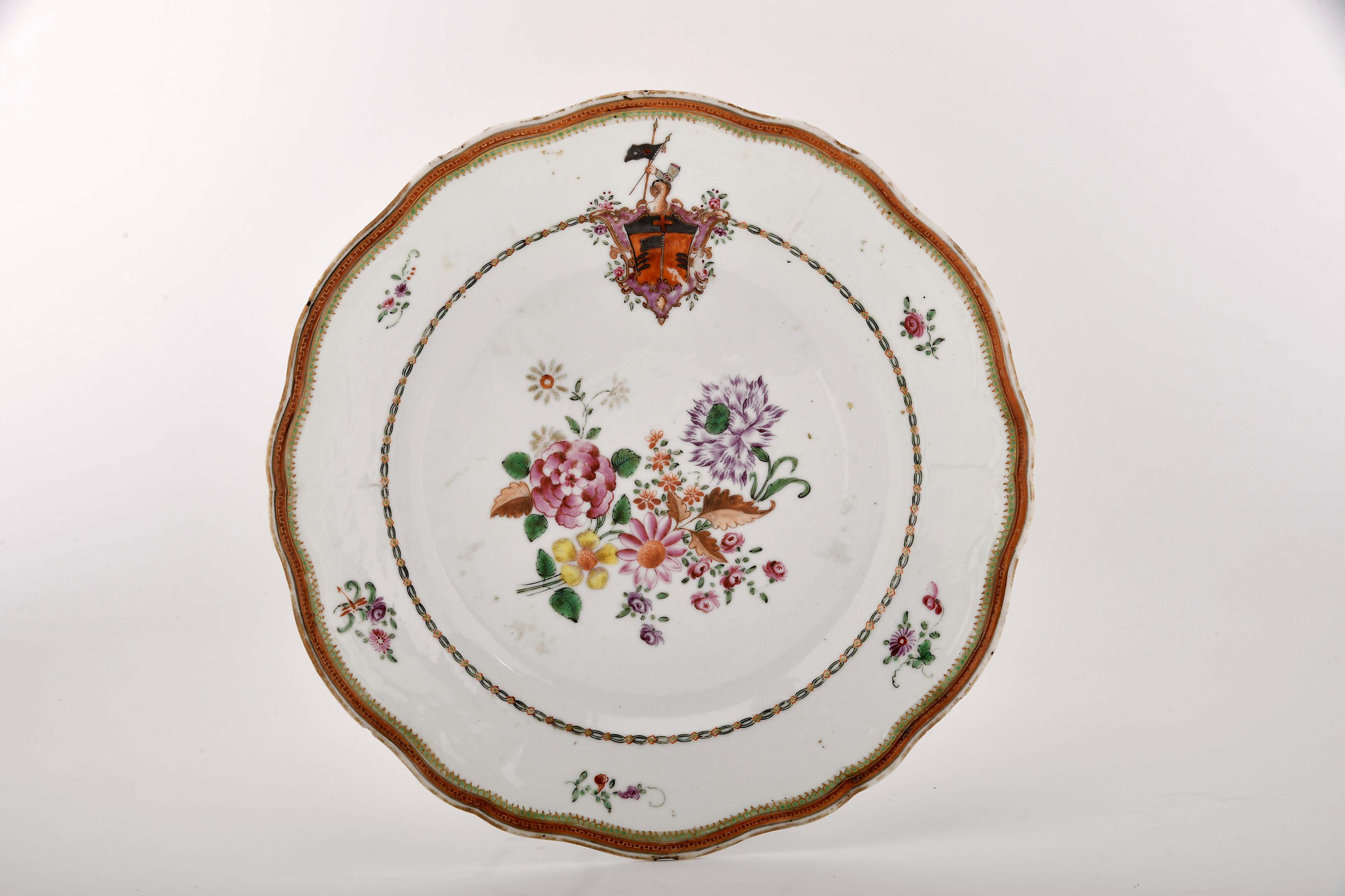 Prato recortado porcelana Chinesa de exportação decoração policromada e dourada "Flores" com armas de António Joaquim da Costa Corte Real (1735-1814) reinado Qianlong (1736-1795) pequenas esbeiçadelas e ligeiro desgaste no vidrado e no brasão Dimensões (altura x comprimento x largura) - 23,7 cm Notas: vd. CASTRO, Nuno de - "A Porcelana Chinesa ao Tempo do Império - Portugal/Brasil". Lisboa: ACD Editores, 2007, p. 185; SANTOS, A. Varela - "Portugal na Porcelana da China - 500 Anos de Comércio", vol. III. Lisboa: Artemágica, 2009, pp. 894-899; e DIAS, Pedro - "Heráldica Portuguesa na Porcelana da China Qing". Lisboa: Fundação Macau, 2014, pp. 140-141.