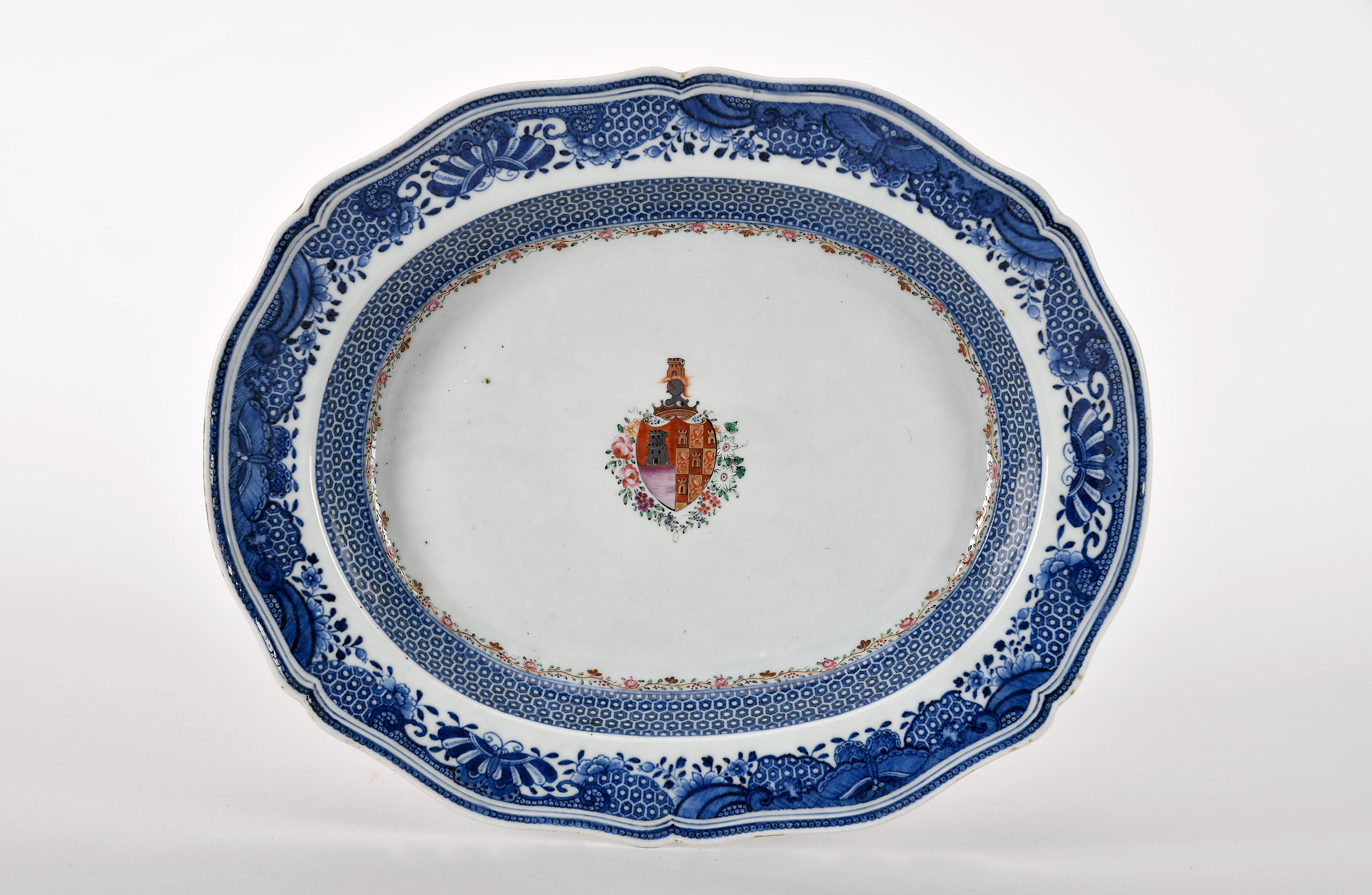Travessa recortada de terrina porcelana Chinesa de exportação aba com decoração a azul "Borboletas e flores", centro com decoração policromada e dourada com armas de António Joaquim de Pina Manique - 2º serviço reinado Qianlong (1736-1795) ligeiro desgaste no dourado Dimensões (altura x comprimento x largura) - 6 x 36,5 x 30 cm Notas: vd. CASTRO, Nuno de - "A Porcelana Chinesa ao Tempo do Império - Portugal-Brasil". Lisboa: ACD Editores, 2007, p. 192, onde se encontra atribuído a seu irmão Diogo Inácio de Pina Manique; SANTOS, A. Varela - "Portugal na Porcelana da China - 500 Anos de Comércio", volume IV. Lisboa: Artemágica, 2010, pp. 1256-1262, nº 6.54, e DIAS, Pedro - "Heráldica Portuguesa na Porcelana da China Qing". Lisboa: Fundação Macau, 2014, pp. 164-165.
