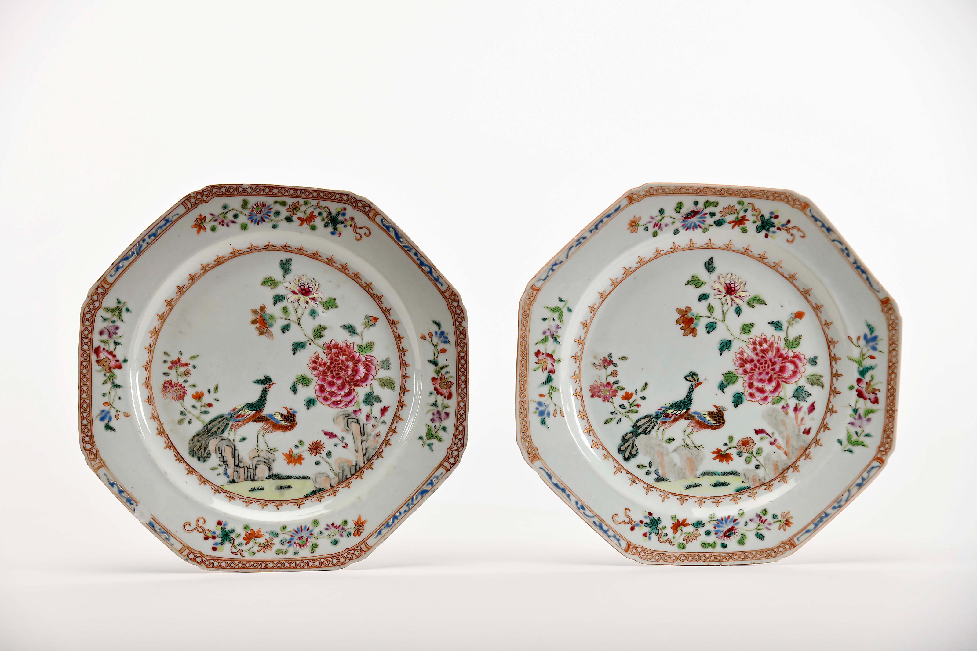 Par de pratos oitavados porcelana Chinesa de exportação decoração policromada e dourada "Pavões" reinado Qianlong (1736-1795) um com pequeno cabelo na aba, esbeiçadelas, ligeiro desgaste na decoração e no dourado Dimensões (altura x comprimento x largura) - 22 cm Notas: decoração idêntica a um dos serviços de mesa que pertenceu ao Rei D. José e que o Rei D. João VI levou para o Brasil, que se encontrava na Real Fazenda de Santa Cruz, Rio de Janeiro - vd. CASTRO, Nuno de - "A Porcelana Chinesa ao Tempo do Império - Portugal/Brasil". Lisboa: ACD Editores, 2007, p. 274; VEIGA, Jorge Getúlio - "Chinese Export Porcelain in Private Brasilian Collections". London: Han-Shan Tang, 1989, p. 199, no 171; e RIGO, André Luíz - "A mesa do rei - a porcelana de Dom João VI, Rei de Portugal, Brasil e Algarves". Videira (SC): Êxito - Editora e Comunicação, 2022, pp. 38-47.