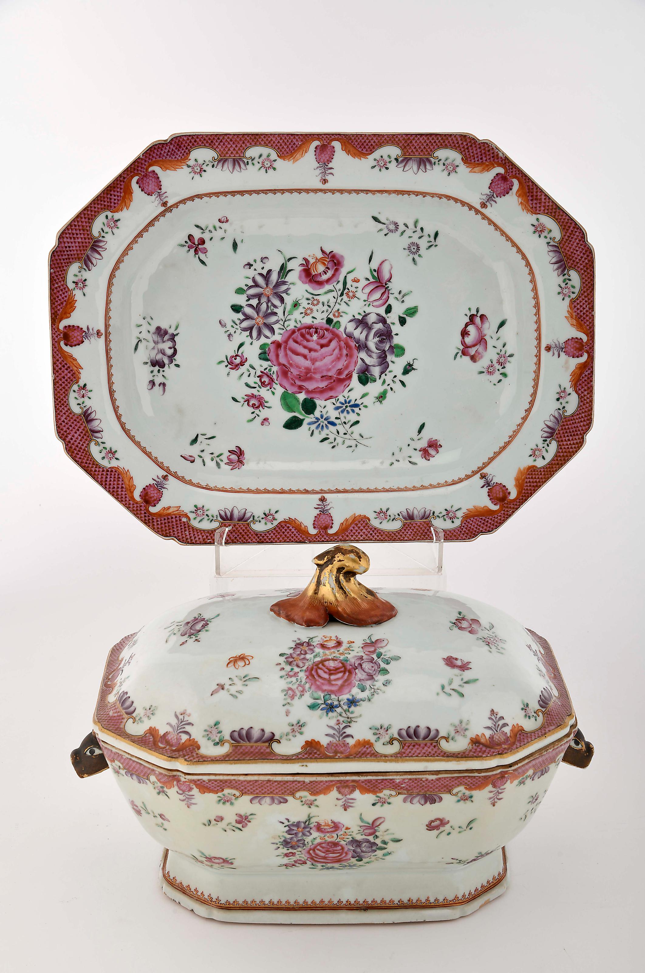 Terrina oitavada com travessa porcelana Chinesa de exportação decoração policromada e dourada "Flores", pegas relevadas "Cabeça de javali", pomo da tampa relevado reinado Qianlong (1736-1795) ínfimas esbeiçadelas, ligeiro desgaste no dourado Dimensões (altura x comprimento x largura) - (terrina) 22,5 x 33 x 22 cm; (travessa) 6,2 x 37,9 x 28,3 cm