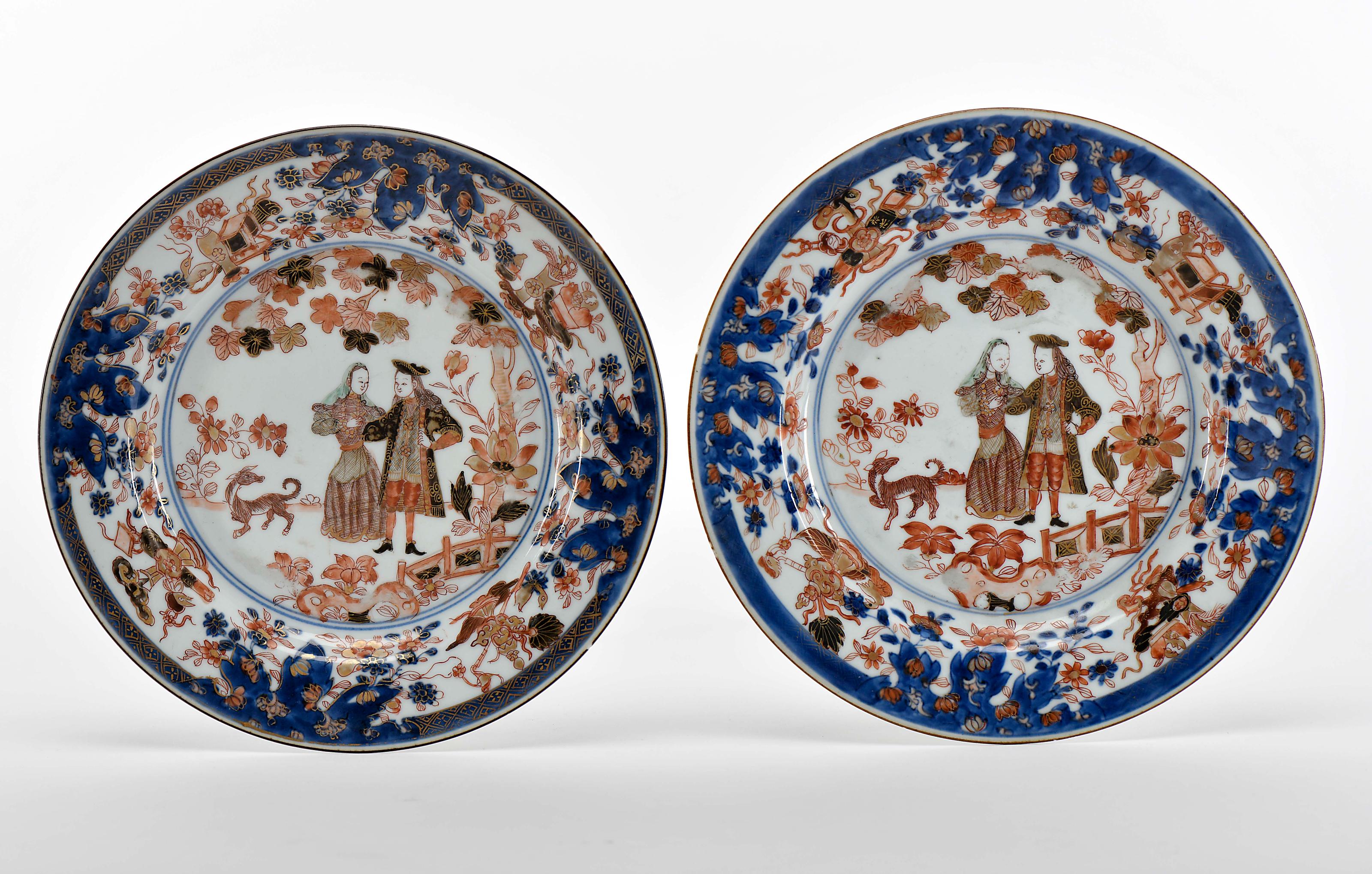 Par de pratos porcelana Chinesa de exportação decoração «Imari» a azul, rou-de-fer e dourado "Governador Duff e sua mulher" reinado Yongzheng (1722-1735) ligeiras faltas no vidrado do bordo, ligeiro desgaste na decoração Dimensões (altura x comprimento x largura) - 23,5 cm Notas: vd. HERVOUET, François et Nicole; BRUNEAU, Yves - "La Porcelaine des Compagnies des Indes à Décor Occidental". Paris: Flammarion, 1986, pp. 152-153, figs. 7.30 a 7.33; e VEIGA, Jorge Getúlio - "Chinese Export Porcelain in Private Brasilian Collections". London: Han-Shan Tang, 1989, p. 81, nº 56.
