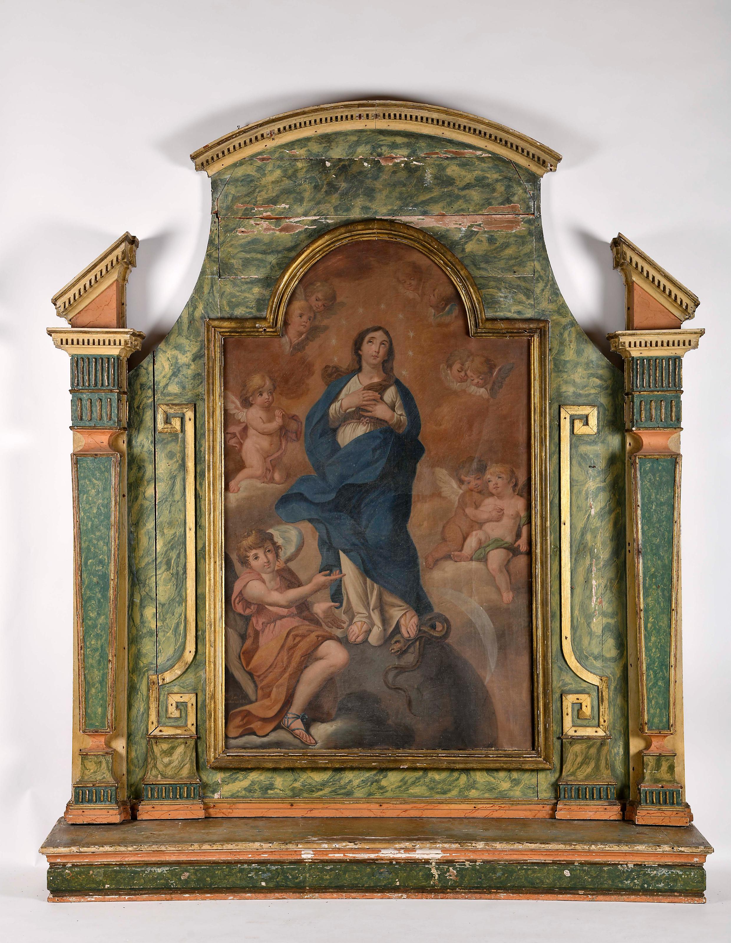 HENRIQUE JOSÉ DA SILVA - 1772-1834 Nossa Senhora da Conceição envolta em anjos e querubins óleo sobre tela moldura/altar D. Maria I (1777-1816) em madeira marmoreada de verde com frisos e entalhamentos dourados moldura/altar com restauros, faltas, defeitos e vestígios de insectos xilófagos pintura assinada e datada de 1804 Dimensões (altura x comprimento x largura) - (pintura) 166 x 102; (total) 251 x 208 x 36,5 cm Notas: pintor português, nascido em Lisboa, que se estabeleceu com a corte portuguesa no Rio de Janeiro, onde morreu. Foi o primeiro diretor da Academia Imperial de Belas Artes do Brasil.