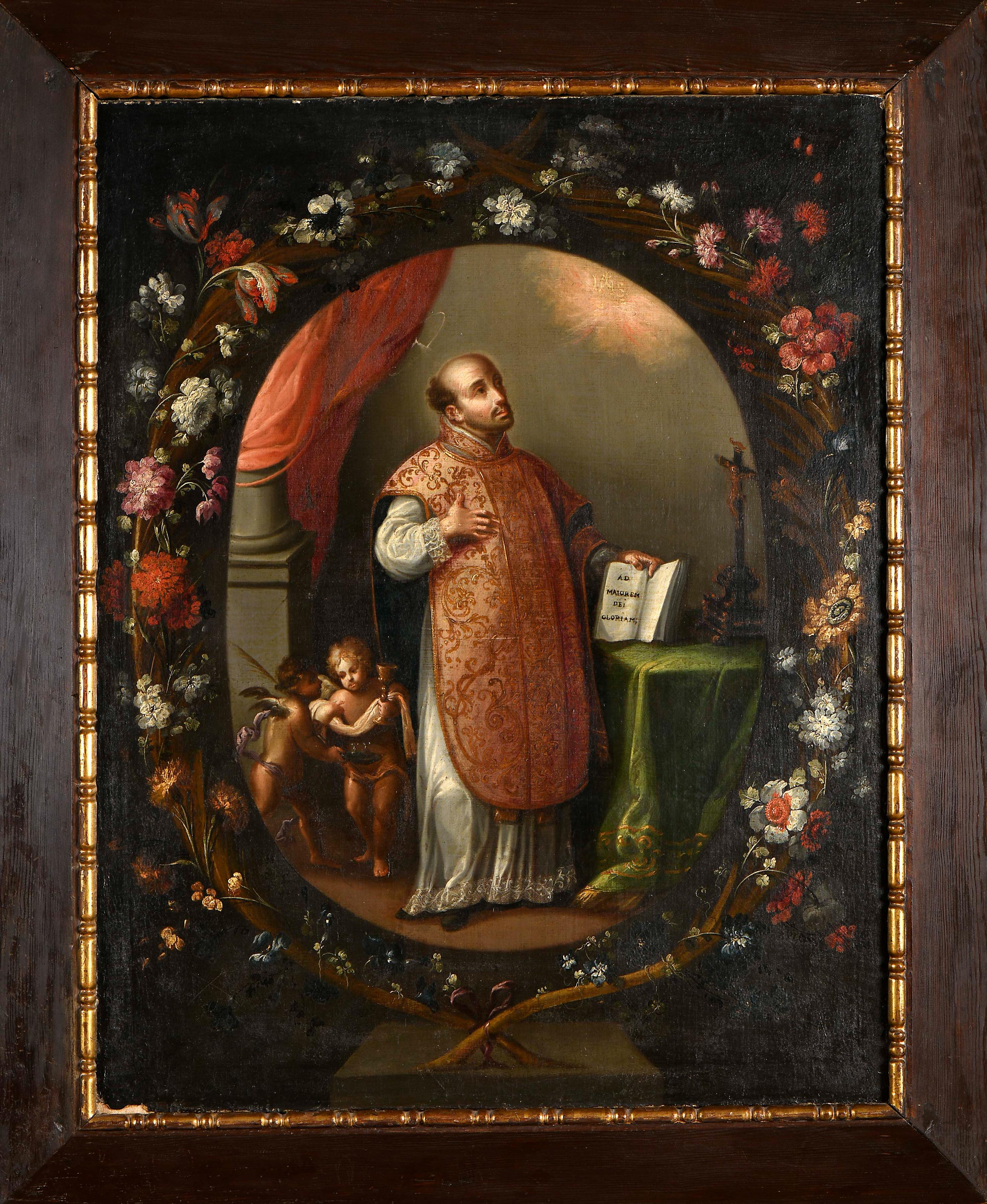 Santo Inácio de Loyola envolto em grinalda de flores óleo sobre tela escola Espanhola séc. XVII reentelado, pequenos restauros, falta no canto inferior esquerdo, outras pequenas faltas na camada pictórica Dimensões (altura x comprimento x largura) - 108 x 85 cm