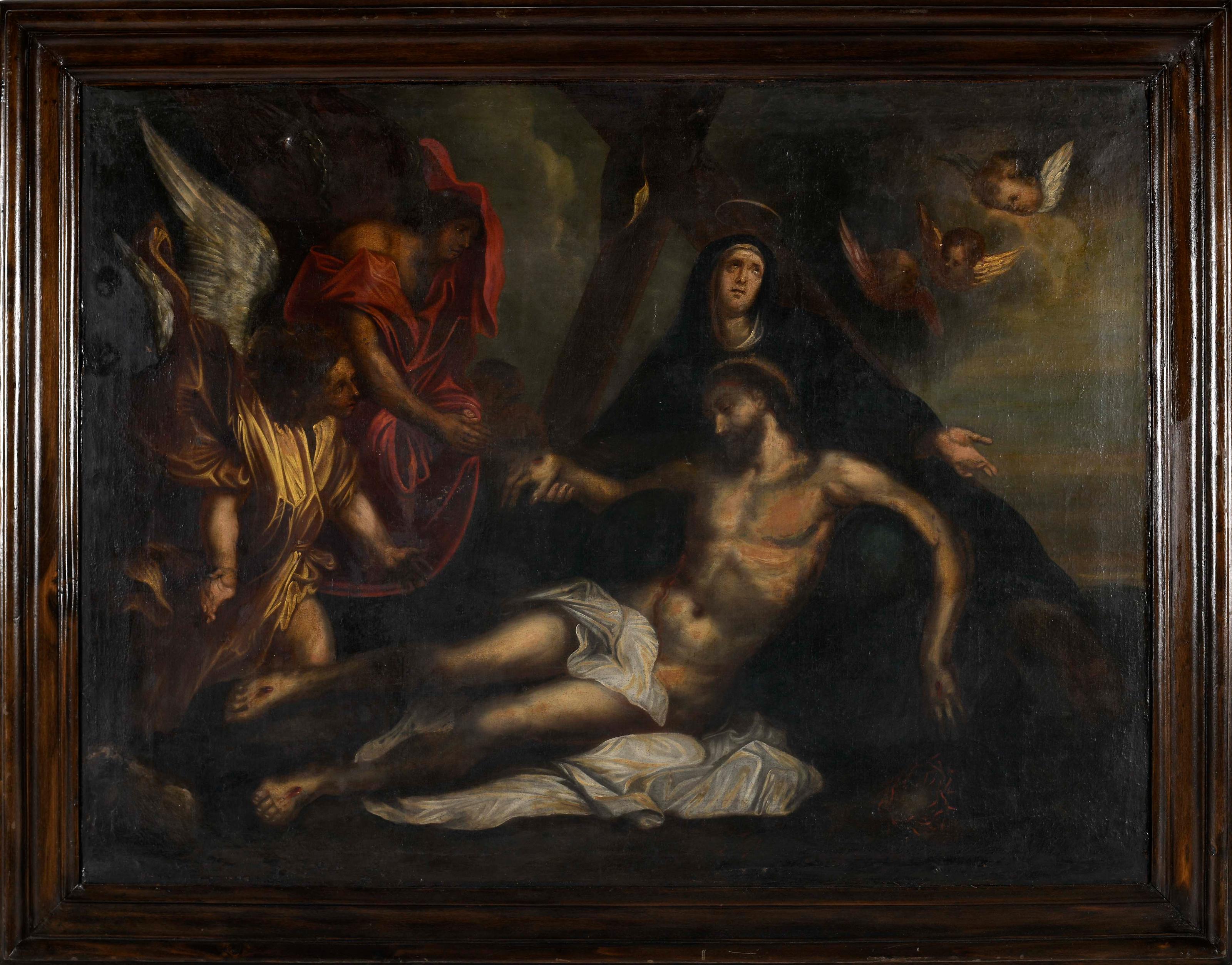 "Lamentação sobre Cristo morto" óleo sobre tela segundo gravura realizada a partir da pintura original de 1634 de Anthony van Dyck (1599-1641) que se encontra no Alta Pinacoteca de Munique escola Portuguesa séc. XVIII reentelado, furo na tela, restauros, pequenas faltas na camada pictórica Dimensões (altura x comprimento x largura) - 87 x 115 cm Notas: vd. https://www.wikiart.org/en/anthony-van-dyck/deposition-1634 - consultado a 14-7-2025, às 11:01.