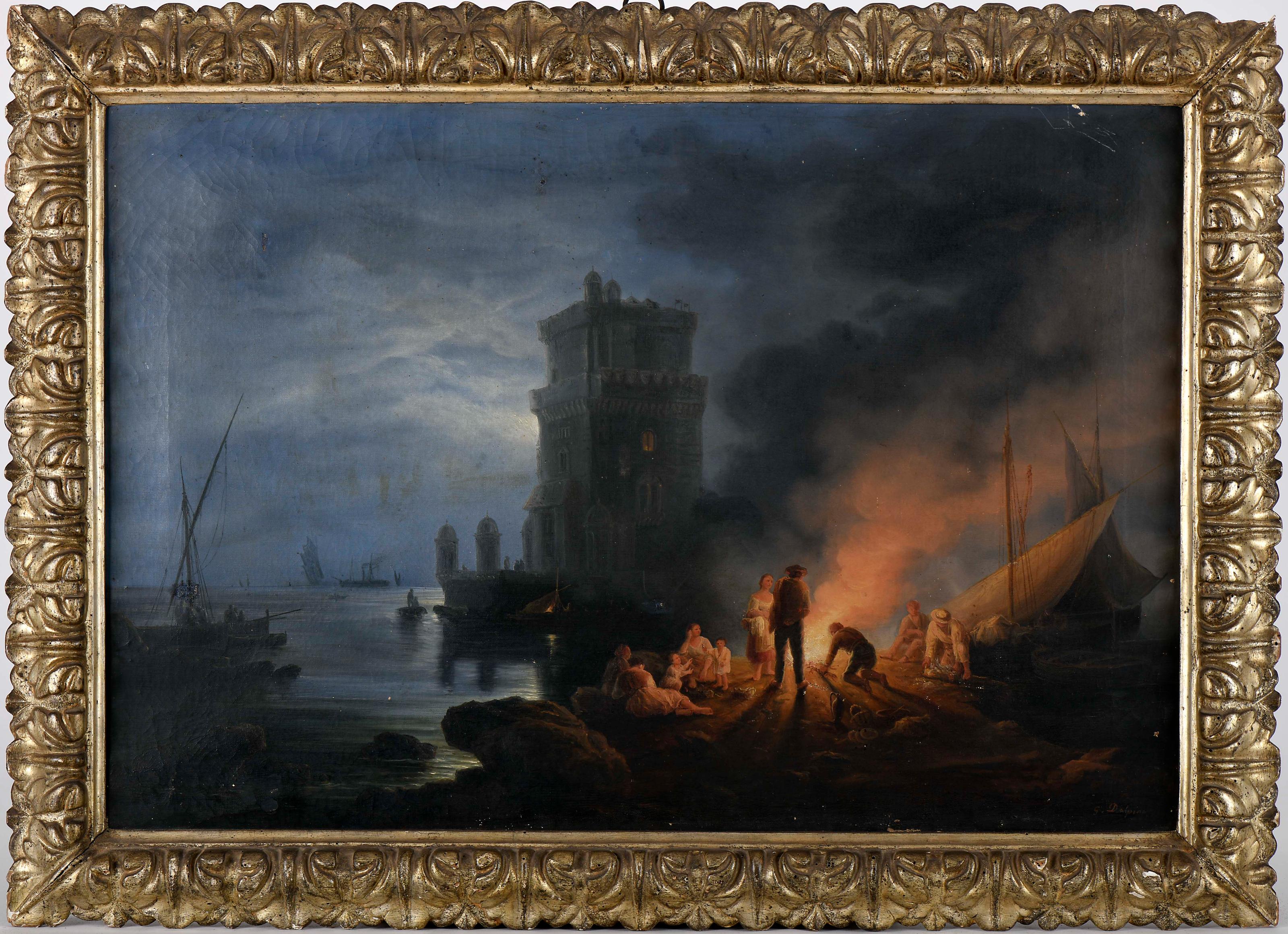 Fogueira perto da Torre de Belém óleo sobre tela escola Italiana pequenos restauros antigos, pequenas faltas na camada pictórica, grade com vestígios de insectos xilófagos assinado G. DELPINO - provavelmente Giuseppe Delpino (séc. XIX) Dimensões (altura x comprimento x largura) - 52,7 x 77,5 cm