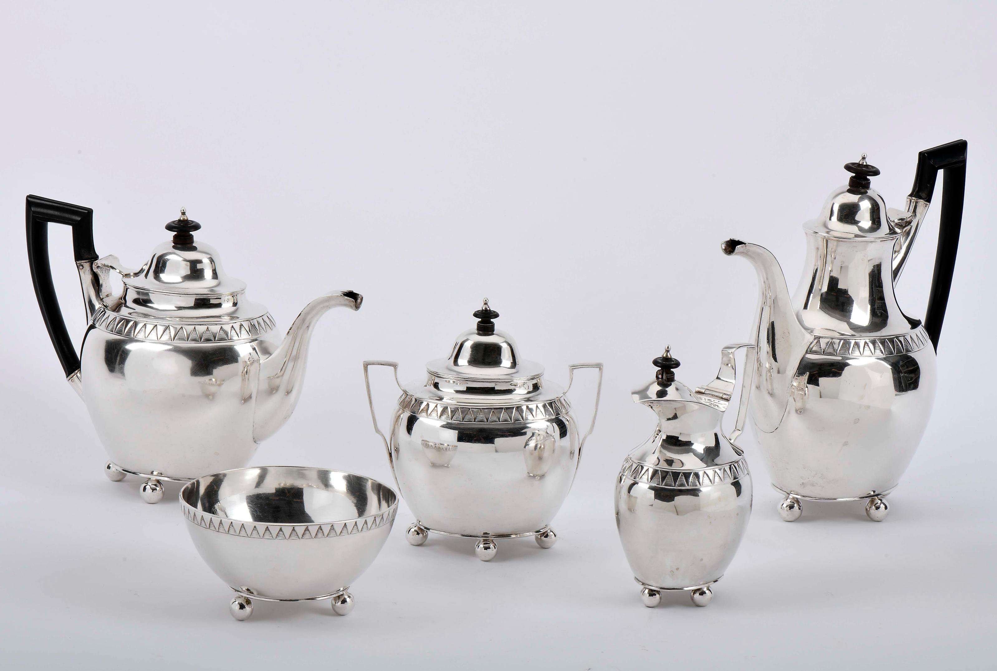 Serviço de chá e de café D. Maria I (1777-1816) prata de 854/1000 frisos relevados "Motivos geométricos", composto por bule, cafeteira, açucareiro, leiteira e taça de pingos, pegas e pomos das tampas em pau-santo Português dois pomos com falta, pequenas amolgadelas marca de ensaiador de Lisboa (1804-1812), marca de ourives atribuível a José Anastácio de Oliveira (1804-1826) Dimensões (altura x comprimento x largura) - (cafeteira) 28,5 cm; Peso - (bruto) 3.753 g. Notas: vd. ALMEIDA, Fernando Moitinho de; CARLOS, Rita - "Inventário de Marcas de Pratas Portuguesas e Brasileiras - Século XV a 1887". Lisboa: IN-CM, 2018, L-37.b e L-408.