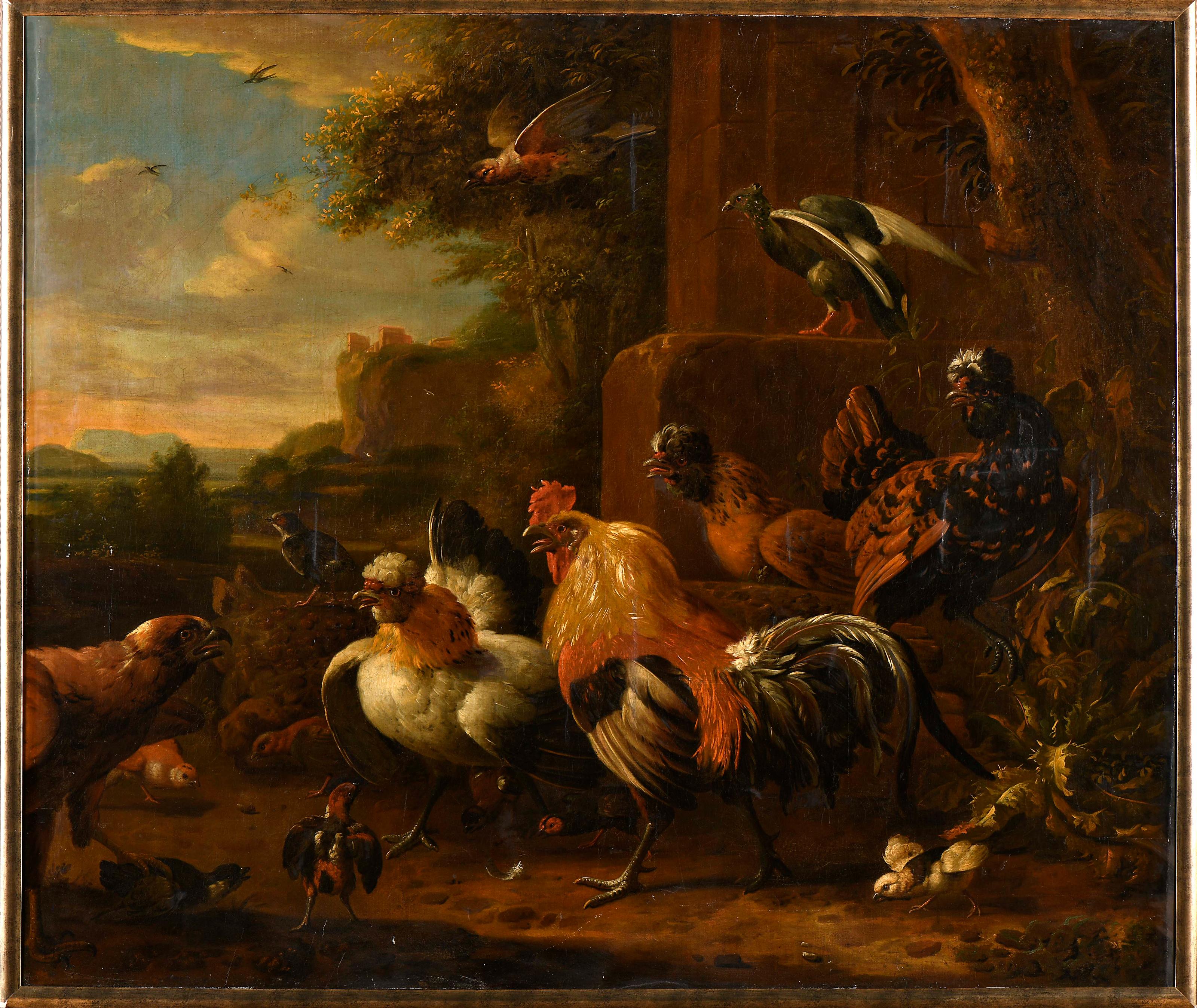 Galos, galinhas e pintos com paisagem em fundo óleo sobre tela escola Europeia séc. XVIII reentelado, restauros, pequenas faltas e defeitos na camada pictórica Dimensões (altura x comprimento x largura) - 122 x 146 cm Notas: verso com etiqueta de colecção inglesa e da THOs. AGNEW & SONS - LONDON.
