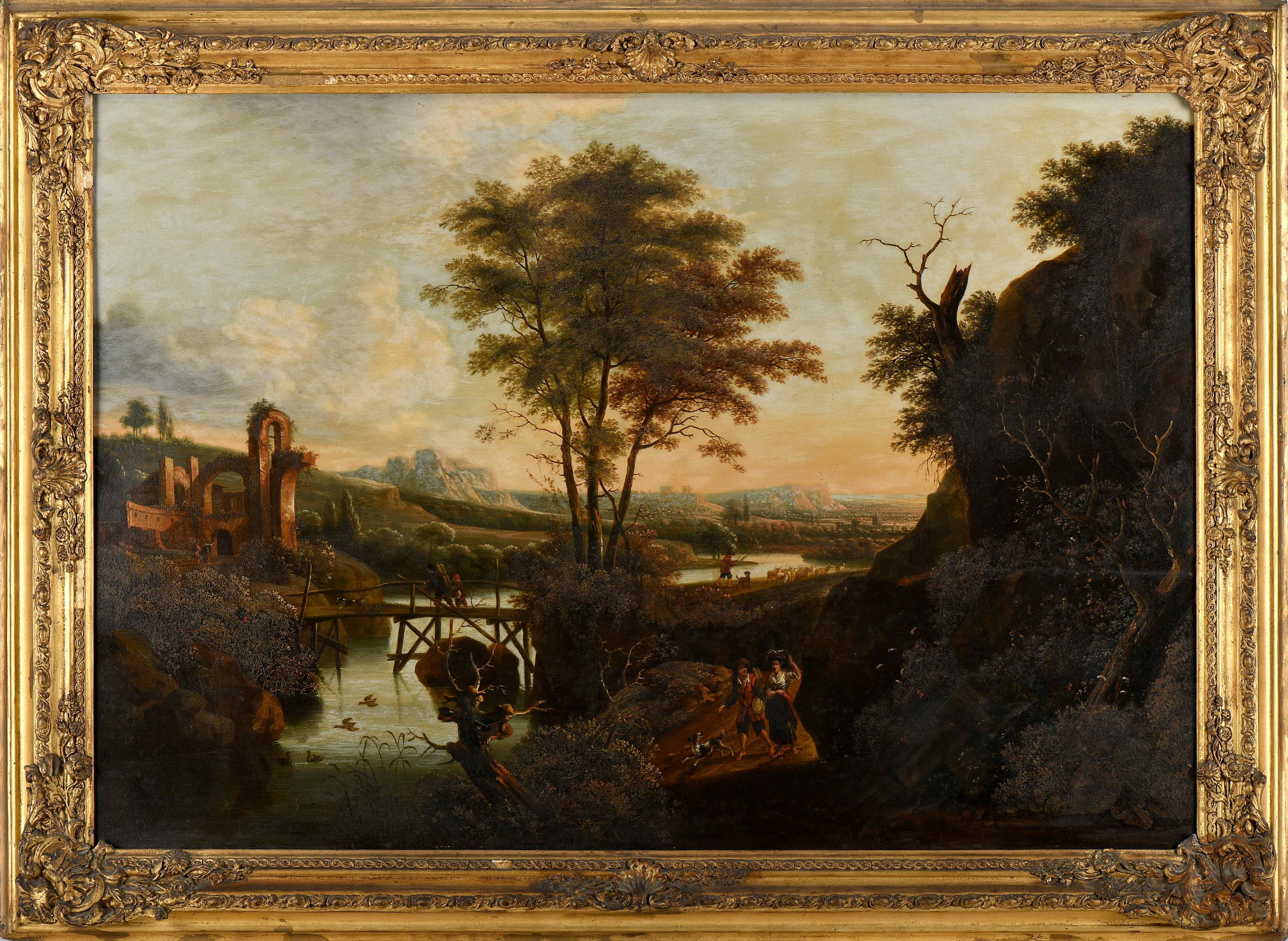 Paisagem - figuras junto a rio e ponte óleo sobre madeira escola Europeia pequenos restauros assinatura sumida e ilegível, datado de 1701 (?) Dimensões (altura x comprimento x largura) - 73 x 108 cm