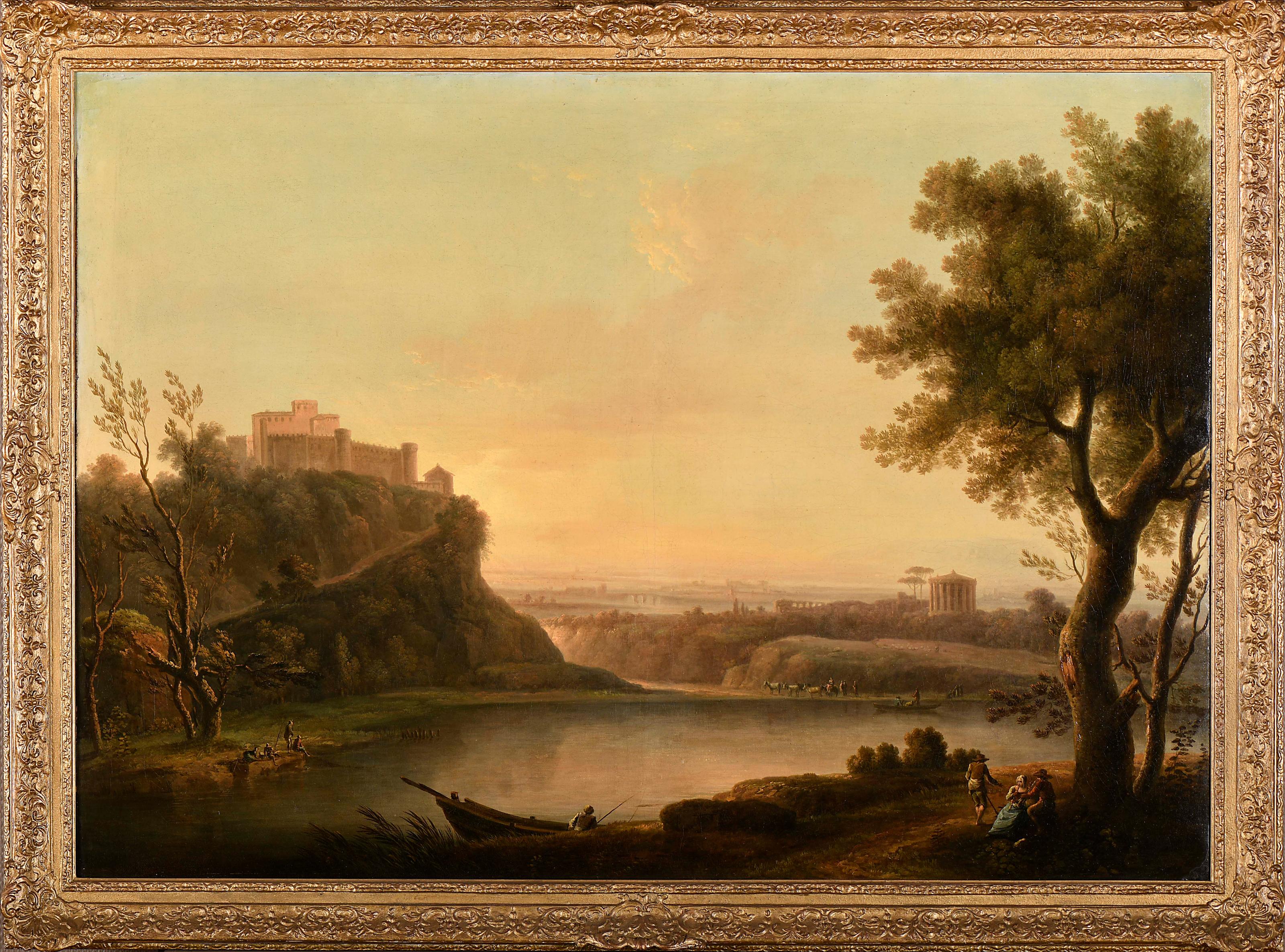 Paisagem - Figuras junto a rio perto de castelo óleo sobre tela escola Europeia séc. XVIII reentelado, pequenos restauros Dimensões (altura x comprimento x largura) - 98 x 136 cm
