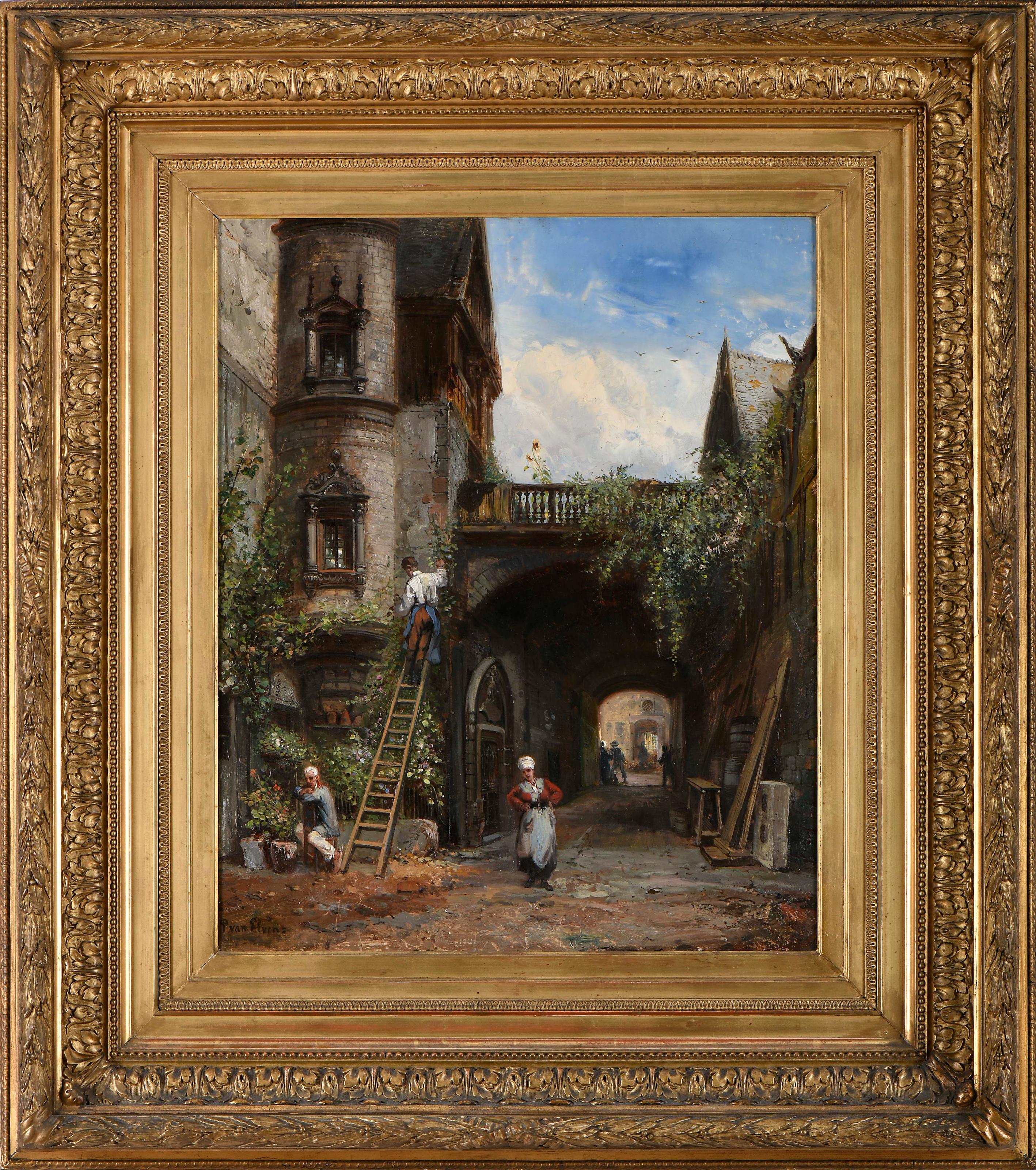 Trecho de rua com figuras óleo sobre tela escola Holandesa séc. XIX reentelado assinado P. VAN ELVEN - provavelmente Pierre Tétar van Elven (1828-1908) Dimensões (altura x comprimento x largura) - 62 x 50 cm