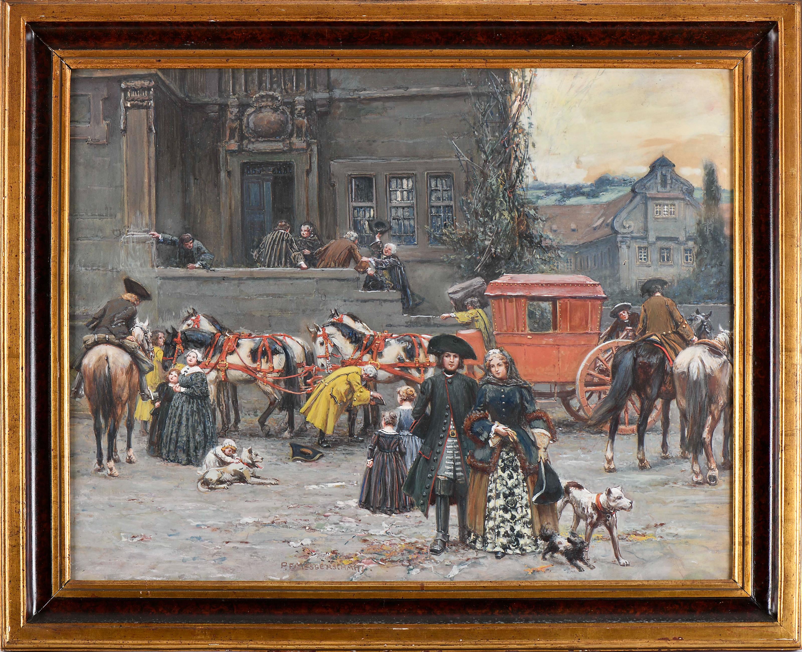Vista de rua com carruagem, figuras e animais guache sobre papel escola Alemã séc. XIX/XX papel com pequenas manchas de humidade assinado P. F. MESSERSCHMITT - provavelmente Pius Ferdinand Messerschmitt (1858-1915) Dimensões (altura x comprimento x largura) - 70 x 89,5 cm