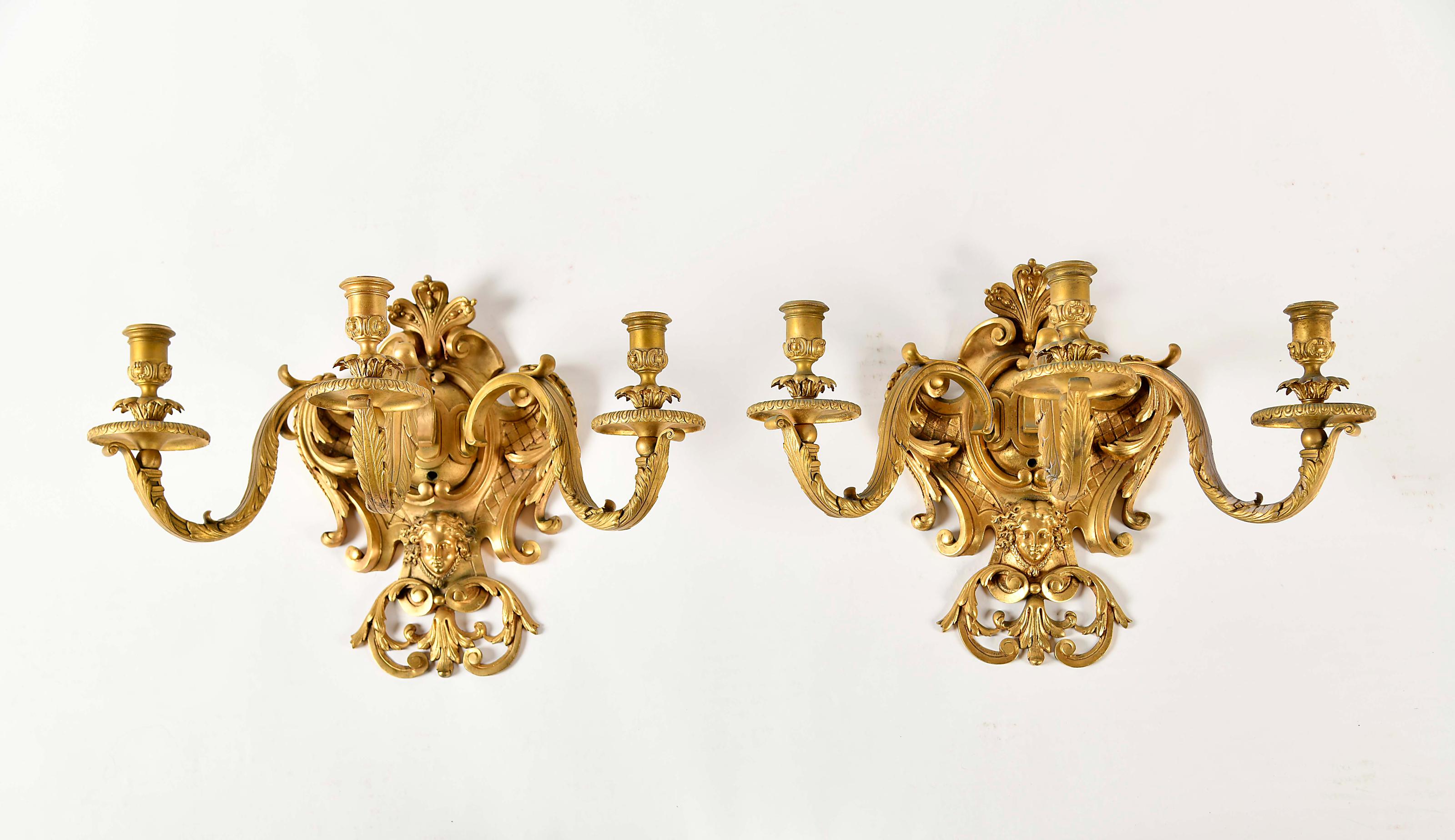 Par de apliques de três lumes bronze relevado e dourado " Motivos vegetalistas e mascarões" Franceses séc. XIX Dimensões (altura x comprimento x largura) - 35 x 47,5 x 20 cm
