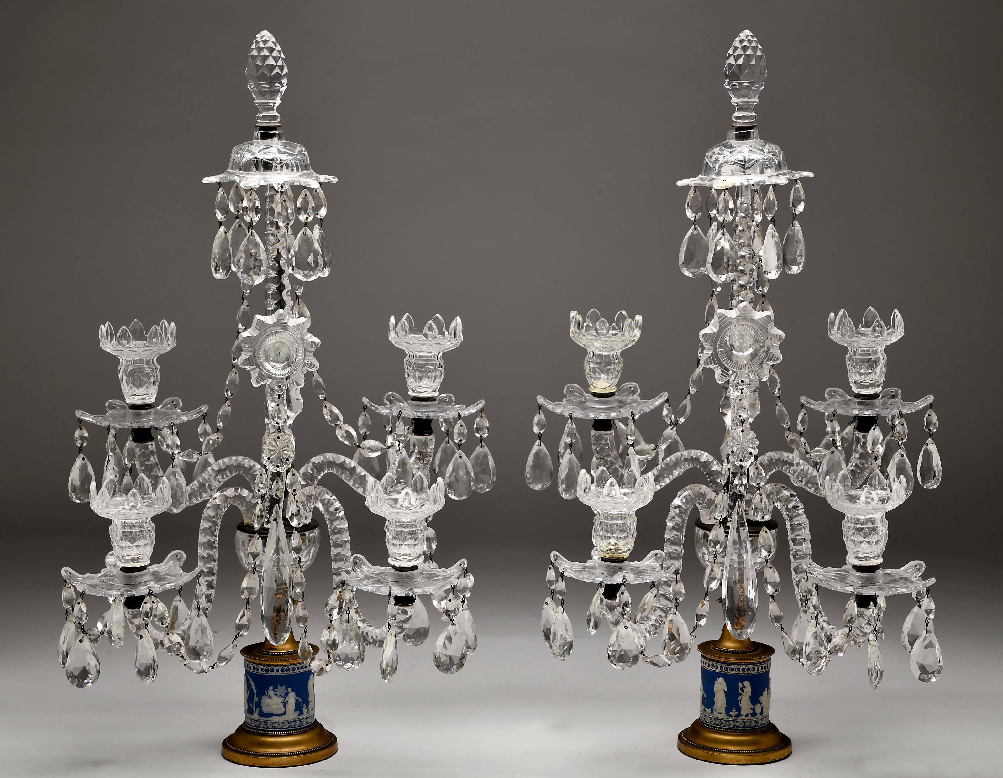 Par de girandolas de quatro lumes estrutura em metal amarelo pingentes em vidro, base em bronze com aplicação de placa em porcelana não vidrada ao gosto de Wedgwood, decoração relevada "Figuras e urnas" Europeias séc. XIX pequenas colagens, pequenas faltas Dimensões (altura x comprimento x largura) - 70 X 39,5 cm