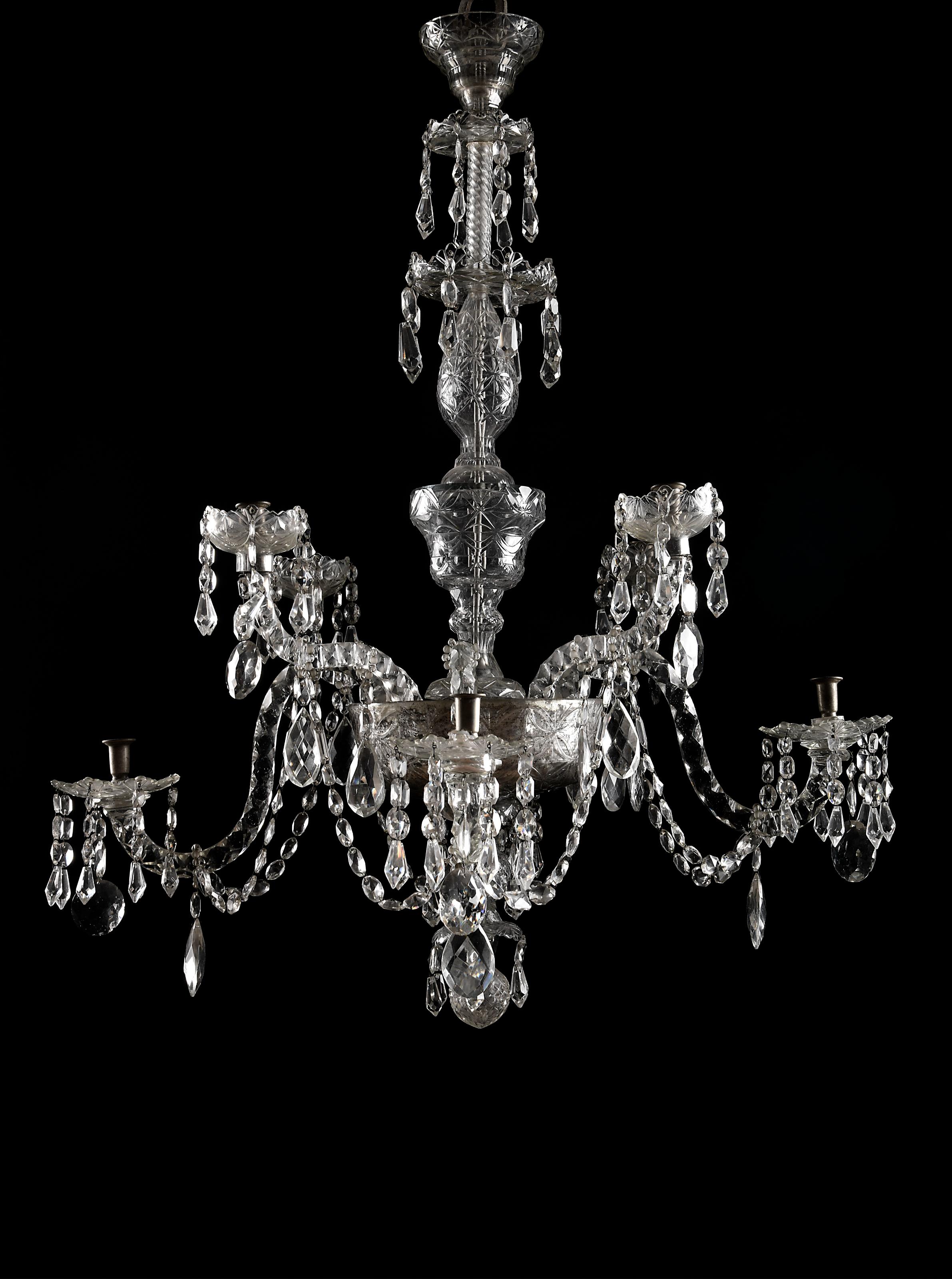 Lustre de oito lumes cristal com pingentes e vidrinhos Europeu séc. XIX restauros, colagens diversas, pequenas faltas e defeitos Dimensões (altura x comprimento x largura) - 105 cm