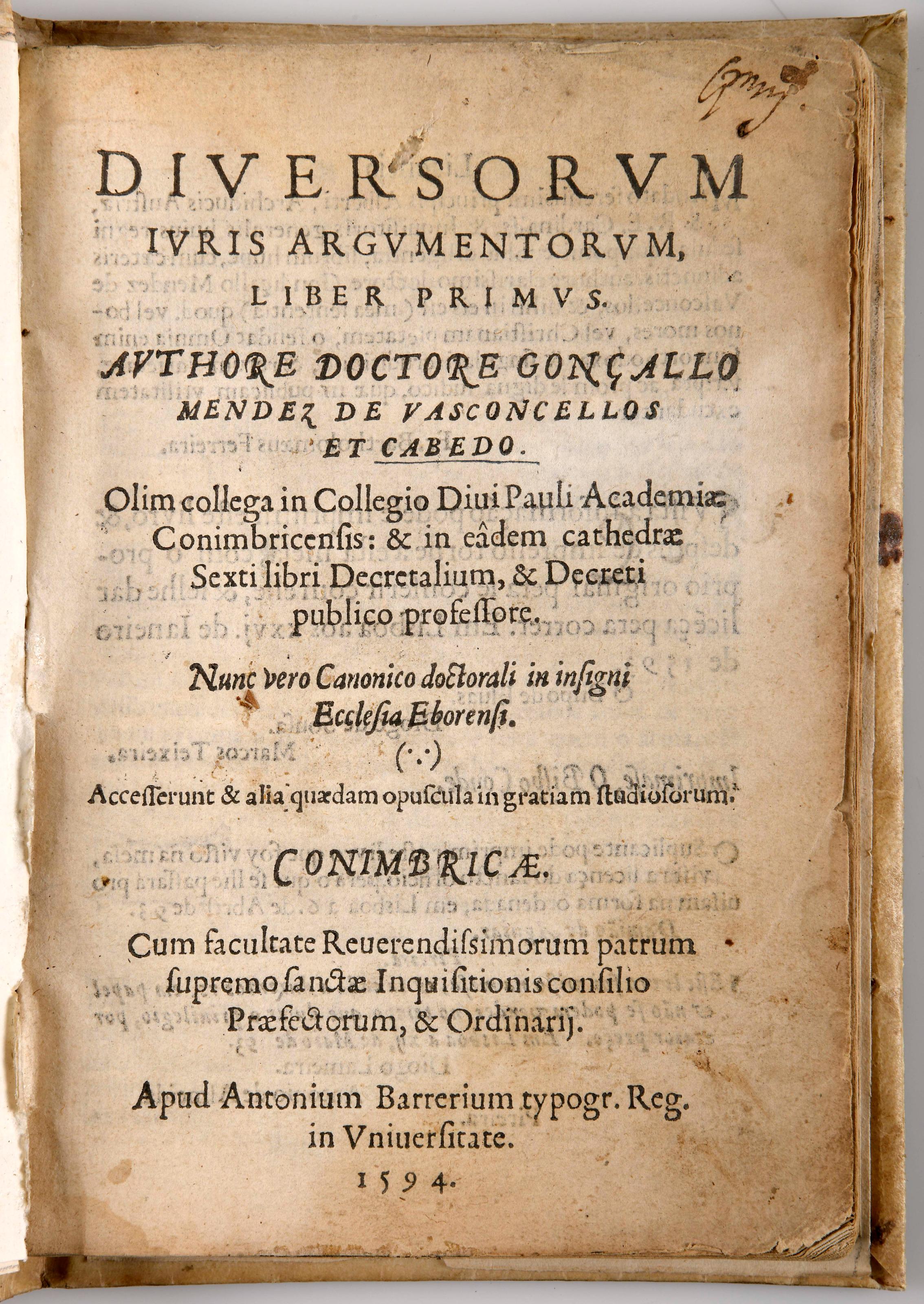 CABEDO, Gonçalo Mendes de Vasconcelos e.- DIVERSORVM | IVRIS ARGVMENTORVM, | LIBER PRIMVS. | AVTHORE DOCTORE GONÇALLO | MENDEZ DE VASCONCELLOS | ET CABEDO. | [...] | Accesserunt & alia quædam opuscula in gratiam studiorum.- Conimbricae: Apud Antonium Barrerium typogr. Reg. in Vniversitate. 1594.- [4], 109, [1 br., 4] f.; 20 cm.- E. Edição quinhentista muito invulgar de uma compilação de argumentos destinados a auxiliar advogados e juristas na construção dos seus casos. O autor (1558?-1604), professor no Real Colégio de São Paulo, em Coimbra, era irmão do célebre Miguel de Vasconcelos e sobrinho de Diogo Mendes de Vasconcelos; foi cónego douoral da Sé de Évora, deputado da Inquisição de Coimbra e de Évora e desembargador da Casa da Suplicação. Exemplar levemente manuseado, com ligeiro aparo; folha de rosto um pouco empoeirada, com minúscula falha junto à primeira linha do título. Encadernação da época, inteira de pergaminho, com guardas novas. Barbosa Machado, II, p. 397. Anselmo, 117 (regista apenas dois exemplares: Biblioteca Nacional e Academia das Ciências). BN (Século XVI), 103. Não referido no Catálogo da Biblioteca de D. Manuel II.