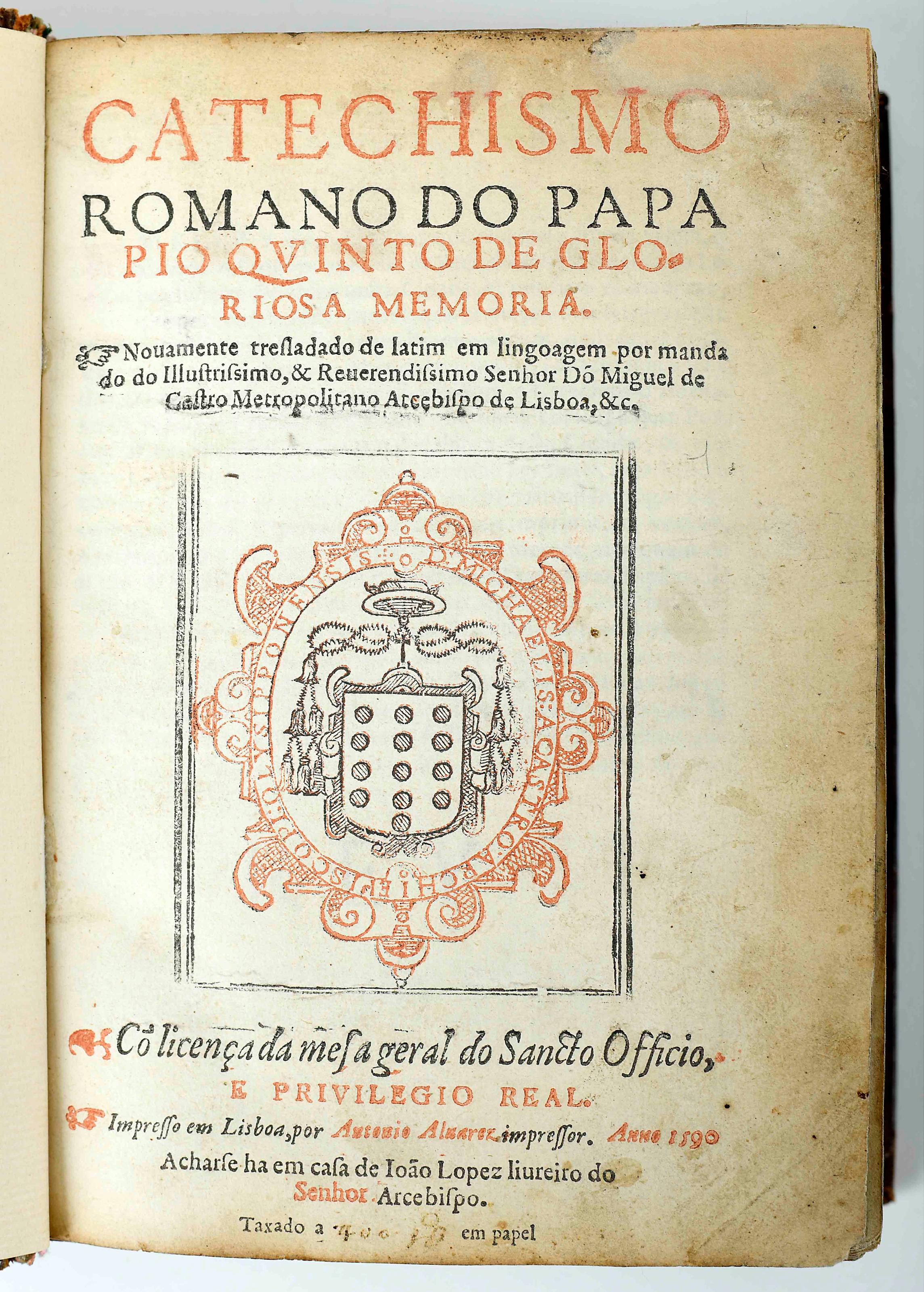 CATECHISMO | ROMANO DO PAPA | PIO QVINTO DE GLO- | RIOSA MEMORIA. | Nouamente tresladado de latim em lingoagem por manda | do do Illustrissimo, & Reuerendissimo Senhor Dõ Miguel de | Castro Metropolitano Arcebispo de Lisboa, &c.- Impresso em Lisboa: por Antonio Alvarez, 1590.- [3], 402 f.; 19 cm.- E. Rara edição quinhentista, em vernáculo, do Catecismo Tridentino, cuja tradutor foi o Pe. Cristóvão de Matos, conforme se pode verificar pela aprovação do censor inquisitorial D. Frei Bartolomeu Ferreira, inserta na frente da terceira folha. O texto, concluído em 1566, na sequência de decisão do Concílio de Trento, foi destinado à instrução de párocos e padres em geral e não directamente à pastoral dos fiéis. O rosto (com uma xilogravura representando as armas de D. Miguel de Castro, arcebispo de Lisboa) e as duas folhas seguintes, foram compostos a preto e vermelho. O exemplar, um pouco aparado e com ocasionais restauros menores marginais, apresenta as folhas A1 e A2 (as duas primeiras folhas do Proémio) encadernadas após a folha A6, mas encontra-se completo e sólido. Encadernação recente, inteira de carneira, com trabalho a seco e a ouro nos planos e lombada (juntas fracas). Anselmo, 11. Biblioteca Nacional (Século XVI), 377. Biblioteca de D. Manuel II, 228