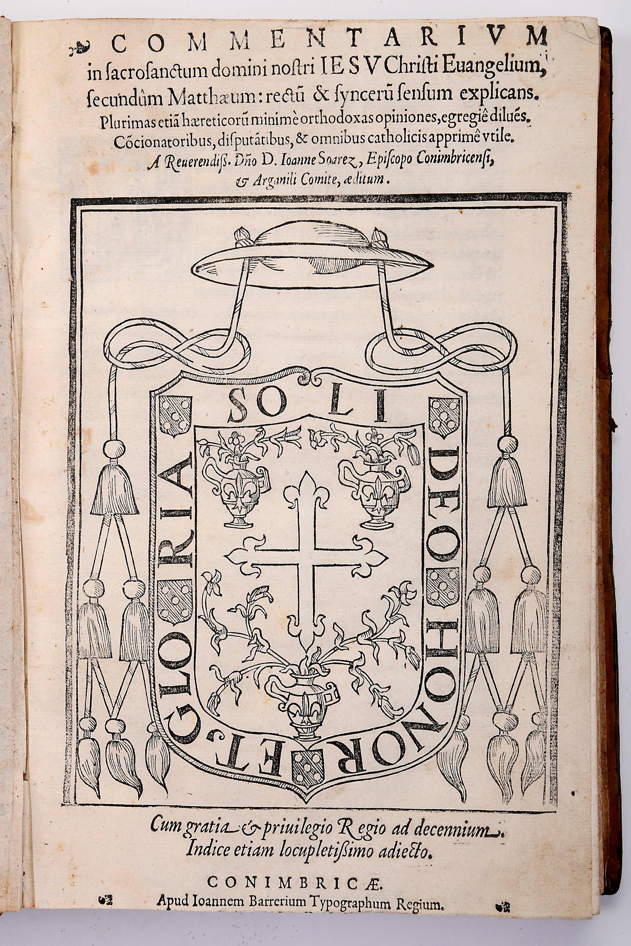SOARES, D. Frei João, O.A.D.- COMMENTARIVM | in sacrosanctum domini nostri IESV Christi Euangelium, | secundum Matthæum: rectu[m] & synceru[m] sensum explicans. | Plurimas etiã hæreticoru[m] minimè orthodoxas opiniones, egregiê dilues. | Cõcionatoribus, disputatibus, & omnibus catholicis apprimê vtile. | A Reuerendiss. Dño. D Ioanne Soarez, Episcopo Conimbricensi, | & Arganili Comite, æditum. | [gravura xilográfica com as armas episcopais] | Cum gratia & priuilegio Regio ad decenium. | Indice etiam locupletissimo adiecto.- Conimbricæ: Apud Ioannem Barrerium Typographum Regium. [Anno M. D. LXII. 1562].- [4], 577 p.; 26 cm.- E. D. Fr. João Soares (1507-1572), natural de Urrô (Penafiel), era eremita de Santo Agostinho e participou na terceira sessão do Concílio de Trento (1561/63); foi confessor de D. João III e bispo de Coimbra entre 1545 e o ano da sua morte. Deixou-nos as constituições da sua diocese (Coimbra, 1548) e extensa bibliografia de temática religiosa, nomeadamente comentários aos Evangelhos de Mateus, Lucas e Marcos. Em 1548 foi responsável pela publicação da novas “Constituições” do seu bispado. Segunda tiragem, com o privilégio real ocupando a frente do segundo fólio. A primeira tiragem (Anselmo, 158), além de outras diferenças, apresenta o privilégio no verso do primeiro fólio. No verso da última folha (em falta no exemplar da BNP) apresenta um cólofon datado de Outubro de 1561. Exemplar, aparado, com ablação da última linha do pé de imprensa (com a data), na página de rosto. De resto, um exemplar muito limpo e completo. Encadernação inteira de carneira, do século XVII(?) com patine racinée, conservando as guardas originais intactas, em papel comum. Anselmo, 164. Biblioteca Nacional (Século XVI), 855. Biblioteca de D. Manuel II refere apenas a edição de 1566. Reiss & Auvermann (Auction 40), 1803 (o mesmo exemplar, com a catalogação equivocada como sendo da primeira tiragem).