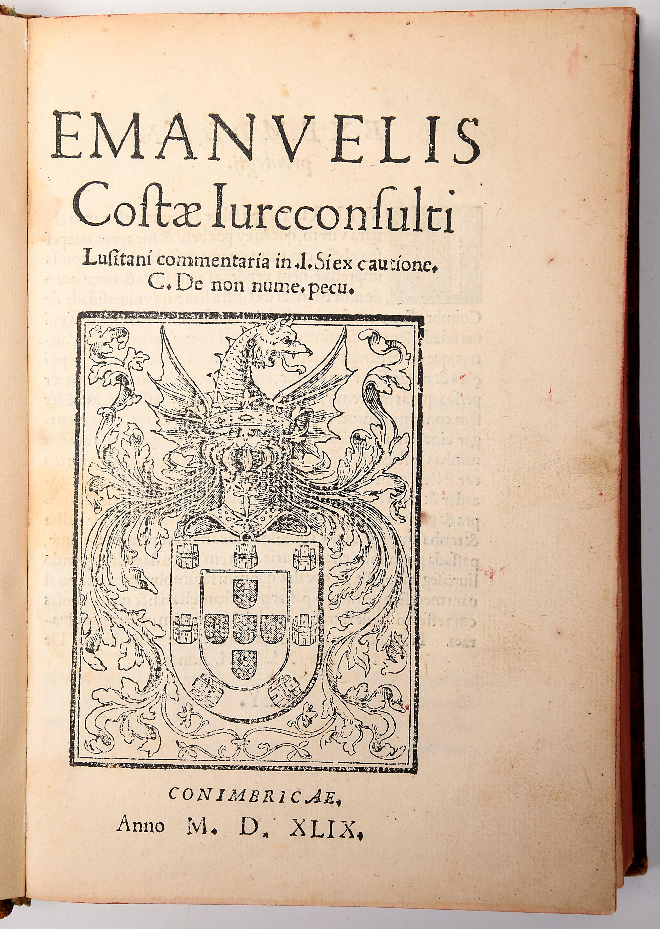 COSTA, Manuel da.- EMMANVELIS | Costæ Iureconsulti | Lusitani commentaria in .l. Si ex cautione. | C. De non nume. pecu. | [gravura xilográfica com as armas de Portugal].- Conimbricae: [no final] Ioannes Barrerius, & Io. Aluarez Regij Typographii excudebat. Annoa Christo nato M. D. XLIX. [1549].- [4], 274, [14] p.; 19 cm. Junto com: -----.- EMMANVELIS | Costæ Iureconsulti Lu | SITANI REGII SENATORIS | de suo & alieno posthumo commen | taria in. § .Posthumus. | Insti. Lega. | Item Scholia in difficilimam .l. St filius hæres institutus sit | omisso posthumo. ff. DE libe. & posthu.- Conimbricae: Excudebant Ioannes Aluarus & Ioannes Barrerius Typographi Regij. Anno. M. D. LII. [1552].- 36 [i. e. 40] p.; 19 cm.- E. Manuel da Costa (c. 1510-1562), poeta, humanista e jurisconsulto português, natural de Lisboa; foi aluno de Jerónimo Cardoso e de Martim de Azpilcueta Navarro, em Coimbra, onde mais tarde leccionou, bem como em Salamanca, onde adquiriu fama. Duas obras jurídicas juntas no mesmo volume, sendo a segunda rara. Volume levemente aparado e com ligeira acidez, mas em geral limpo. Encadernação recente, inteira de carneira, da oficina de Mestre Império Graça, com decoração a seco nos planos; lombada com sinais de degradação e de trabalho de traça. Anselmo, 262 e 288. Biblioteca Nacional (Século XV), 204 (mas não referindo a segunda obra). Biblioteca de D. Manuel II, 132 (também não refere a segunda obra).