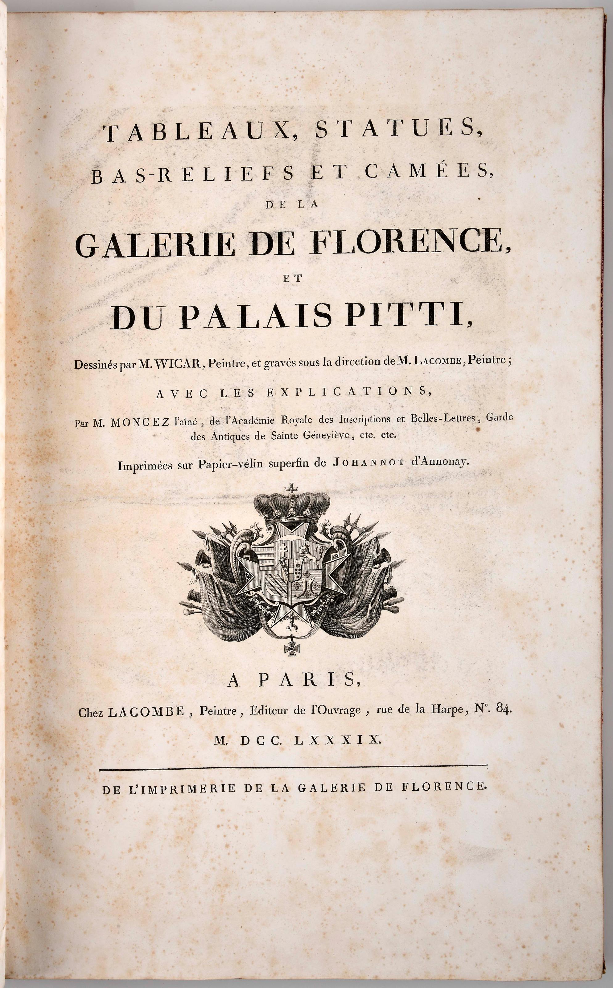WICAR, Jean Baptiste (il.).- Tableaux, statues, bas reliefs et camées de la Galerie de Florence et du Palais Pitti, / dessinés par M. Wicar, Peintre, et gravés sous la direction de M. Lacombe, Peintre; avec les explications par M. Mongez l’ainé...- Paris: Chez Lacombe, 1789-1807.- 4 vols.: il.; 50 cm.- E. Obra monumental, inicialmente publicada em 50 fascículos (livraisons), cada um dos quais contendo quatro gravuras, acompanhadas dos respectivos textos descritivos. Os desenhos originais de Jean Baptiste Wicar (1762-1834), pintor neo-clássico e colecionador francês, natural de Lille, perderam-se no incêndio que ocorreu em 1871 na Biblioteca do Museu do Louvre. O primeiro volume inclui ainda um frontispício gravado, perfazendo assim um total de 201 gravuras a talhe-doce, a maioria duplas (duas imagens por página). Exemplar por vezzes com algumas manchas de acidez, mas, em geral, limpo. Ex-libris heráldico de Luiz Vasconcellos Porto. Boas encadernações inteiras de marroquim vermelho calandrado, da primeira metade do século XIX, com algum desgaste e ocasionais esfoladelas (sobretudo nos volumes III e IV); decoração dos planos com múltiplas cercaduras a seco e a ouro, entrenervos com trabalho a ouro, roda nas seixas e o corte das folhas dourado. Cohen (Livres à gravures), 225.