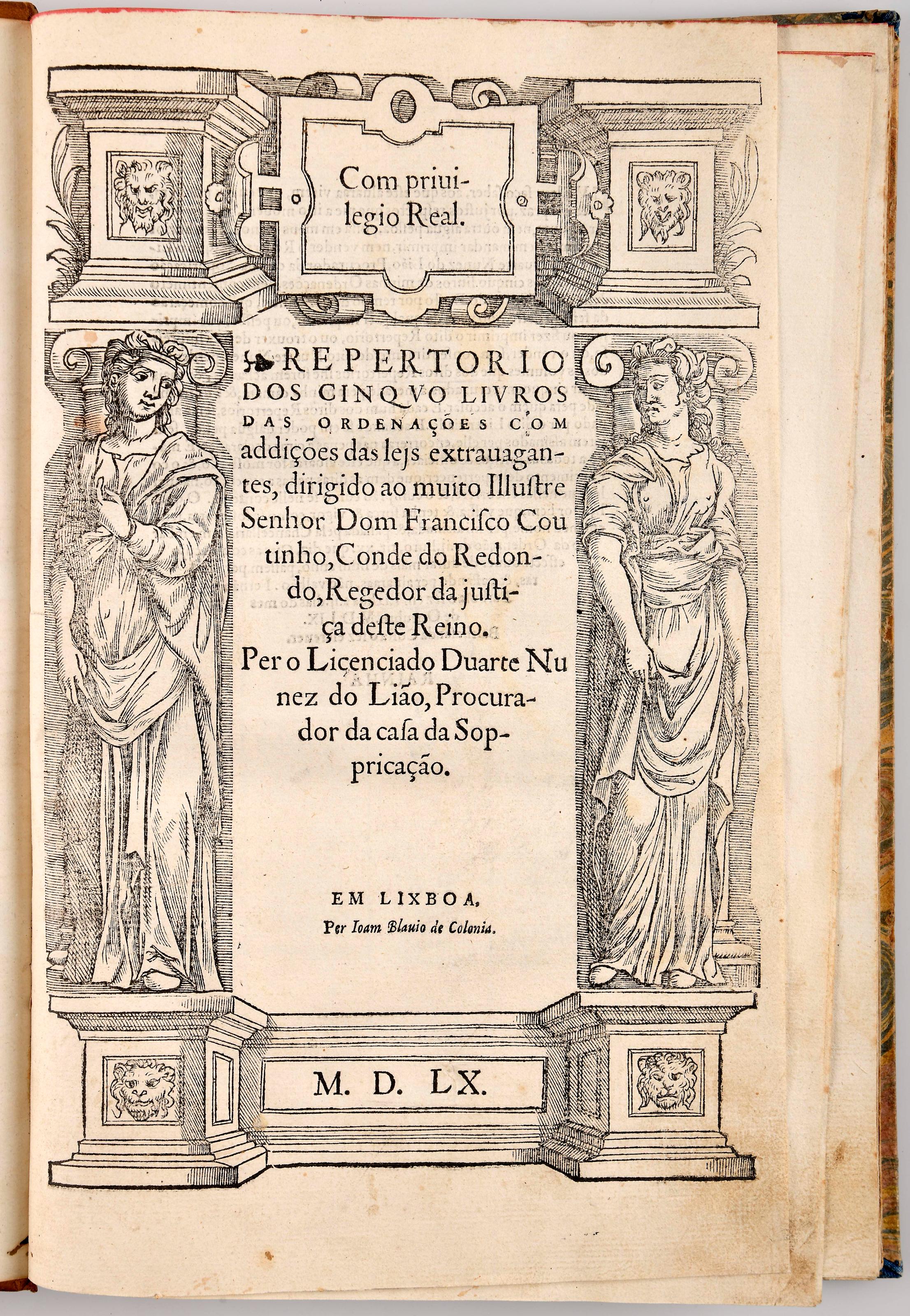 LEÃO, Duarte Nunes de.- REPERTORIO | DOS CINQVO LIVROS | DAS ORDENAÇÕES COM | addições das lejs extrauagan- | tes, dirigido ao muito Illustre | Senhor Dom Francisco Cou | tinho, Conde do Redon- | do, Regedor da justi- | ça deste Reino. | Per o Licenciado Duarte Nu | nez do Lião, Procura- | dor da casa da Sop- | pricação.- Em Lixboa: Per Ioam Blauio de Colonia. M. D. LX. [1560].- [2], 112 f.; 28 cm.- E. Duarte Nunes (1530-1608), erudito historiador, licenciado em Direito, cronista e desembargador da Casa da Suplicação, após a morte do Cardeal Rei D. Henrique abraçou calorosamente a causa de Filipe I, cujo direito à sucessão defendeu por escrito contra os que o impugnavam. Importante espécie tipográfica quinhentista, saída dos prelos de João Blávio de Colónia, impressor alemão que trabalhou em Lisboa entre 1554 e 1563, tendo produzido mais de 50 trabalhos tipográficos. As duas folhas preliminares integram: rosto, com título enquadrado em moldura xilográfica arquitectónica; no verso, alvará régio datado de 2 de Outubro de 1559; segue-se a dedicatória MVITO ILLVSTRE SENHOR (a D. Francisco Coutinho, conde do Redondo); no verso, um pequeno bloco de 14 linhas AOS LECTORES, com indicações sobre a organização da obra. Exemplar levemente aparado (corte das folhas carminado à cabeça), mas muito limpo e sólido; folha de rosto um pouco mais curta na margem exterior. Encadernação do século XX, com a lombada em pele, com alguns danos nas coifas. Anselmo, 335. Samodães, 2248. Biblioteca Nacional (Século XVI), 411. Biblioteca de D. Manuel II, 247.
