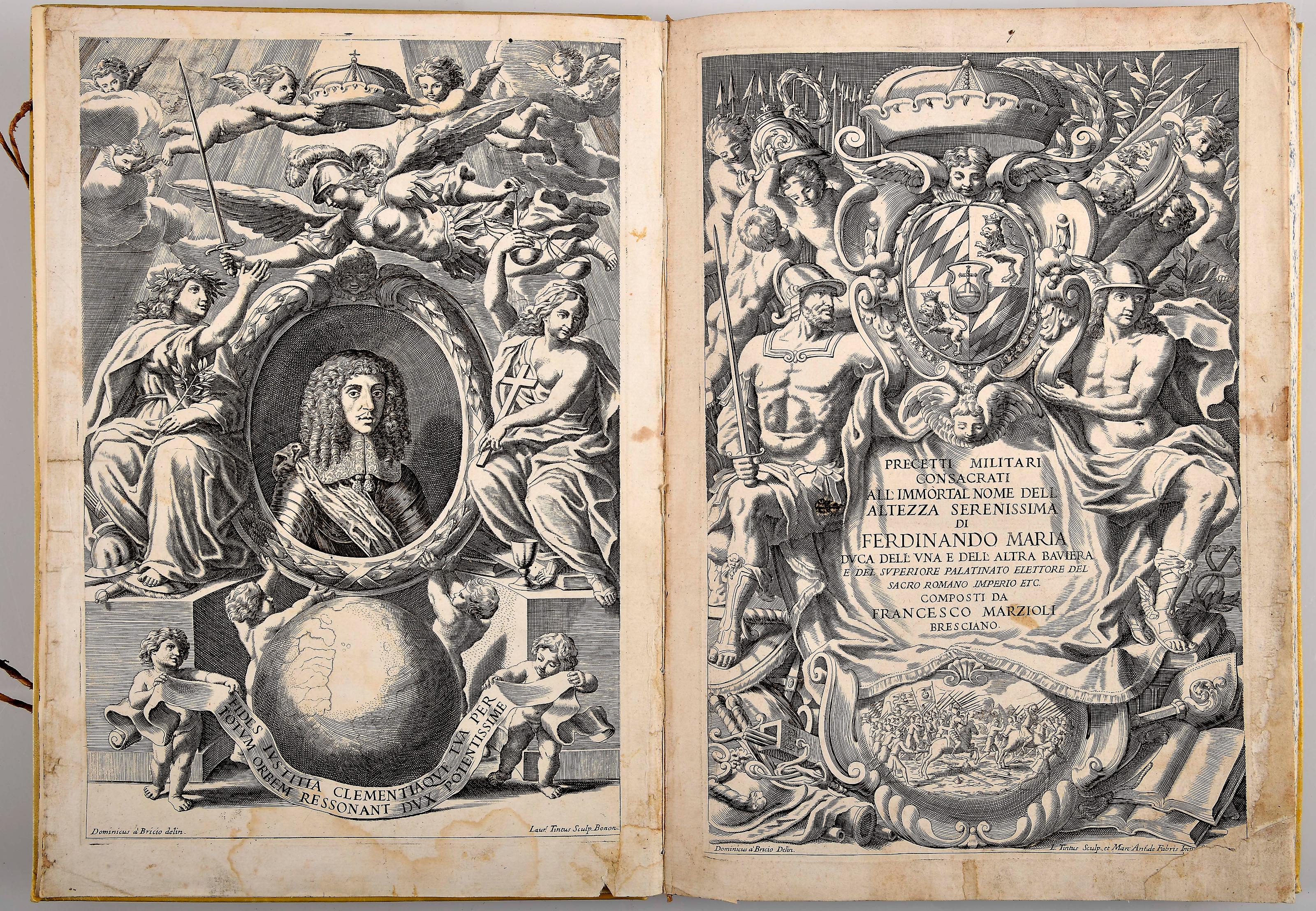 MARZIOLI, Francesco.- PRECETTI MILITARI | CONSACRATI | ALL’IMMORTAL NOME DEL | ALTEZA SERENISSIMA | DI | FERDINANDO MARIA | DVCA DELL’VNA E DELL’ ALTRA BAVIERA | [...] | COMPOSTI DI | FRANCESCO MARZIOLI | BESCIANO.- In Bologna: Per l’Erede di Domenico Barbieri. Apresso Gio. Francesco Dauico detto il Turrini. M. DC. LXXIII. [1673].- 166, [6] p.: il.; 37 cm.- E. Segunda edição, idêntica à primeira publicada em 1670, de um importante tratado de arte militar de cujo autor (fl. 1670) apenas sabemos ser natural de Brescia. Obra composta por 33 capítulos sobre o uso da lança (com 17 gravuras, sendo 16 duplas), 20 sobre o uso do mosquete (10 grav. duplas), 28 sobre táctica de infantaria (28 grav.) e 9 sobre a disposição das tropas em batalha (9 grav.). A obra, dedicada a Fernando Maria da Baviera (1636-1679), é ilustrada com o seu retrato, junto ao frontispício alegórico e um conjunto notável de 64 gravuras a talhe-doce com numeração descontínua (1-17, 21-30, 33-46, 48-61, 64, 66, 68, 70, 72, 74, 77, 79, 81), a maioria das quais impressas em separado. Exemplar lavado, com algumas imperfeições menores, nomeadamente: duas primeiras gravuras um pouco manuseadas e restauradas, com pequeno prejuízo do canto inferior externo da folha de rosto; alguns restauros marginais nas primeiras seis folhas de texto. De resto, um exemplar limpo e completo, conservando todas as gravuras muito frescas e com boas margens. Encadernação inteira de pergaminho, não contemporânea, com guardas novas.