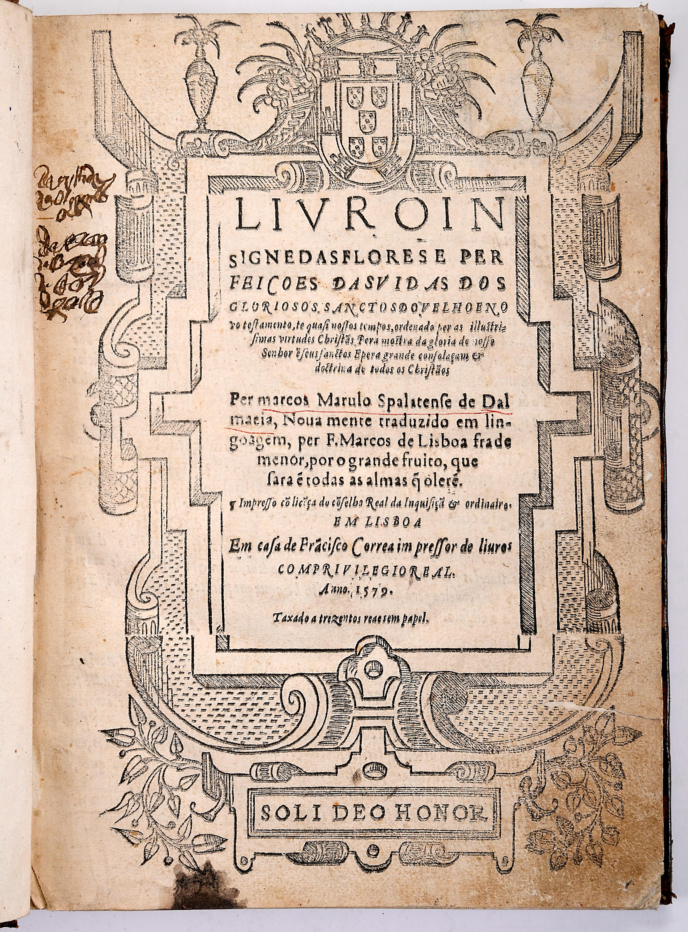 MARULIC, Marco.- LIVRO IN | SIGNE DAS FLORES E PER | FEICOES DAS VIDAS DOS | GLORIOSOS SANCTOS DO VELHO E NO | vo testamento, te quasi nossos tempos, ordenado per as | illustri- | simas virtudes Christãs. Pera mostra da gloria de nosso | Senhor ë seus sanctos E pera grande consolaçã[o e] | doctrina de todos os Christão[s] | Per marcos Marulo Spalaten[ce de Dal] | macia, Nouamente traduzi[do em lin-] | goagem, per F. Marcos de Lisb[oa frade] | menor, por o grande fruito, que | sara ë todas as almas q o lerë.- Em Lisboa: Em casa de Frãcisco Correa, 1579.- [6], 295 [i. e. 285] f.; 26 cm.- E. Rara tradução de uma das obras mais conhecidas de um erudito natural de Spalato (1450-1524), na Dalmácia (hoje Split, na Croácia), que viveu os últimos anos da sua vida em isolamento para se dedicar ao estudo da Teologia. Trata-se igualmente de uma importante espécie quinhentista portuguesa, com interessante arranjo xilo-tipográfico do rosto, da qual existem duas variantes (ver BN, 495/496). O presente exemplar parece ser, no entanto, um misto de ambas, já que apresenta a última folha numerada 295 e um único caderno. Exemplar um pouco aparado e manuseado; pertence riscado antigo e pequena mancha de tinta na página de rosto; última folha com restauro grosseiro no verso, afectando ligeiramente o texto (no recto) e diversas inscrições e rabiscos no verso. Encadernação do século XVII(?), inteira de carneira, com alguns danos na lombada, mas recuperável. Anselmo, 513. Samodães, 1792. Biblioteca Nacional (Século XVI), 495/496. Biblioteca de D. Manuel II, 165.