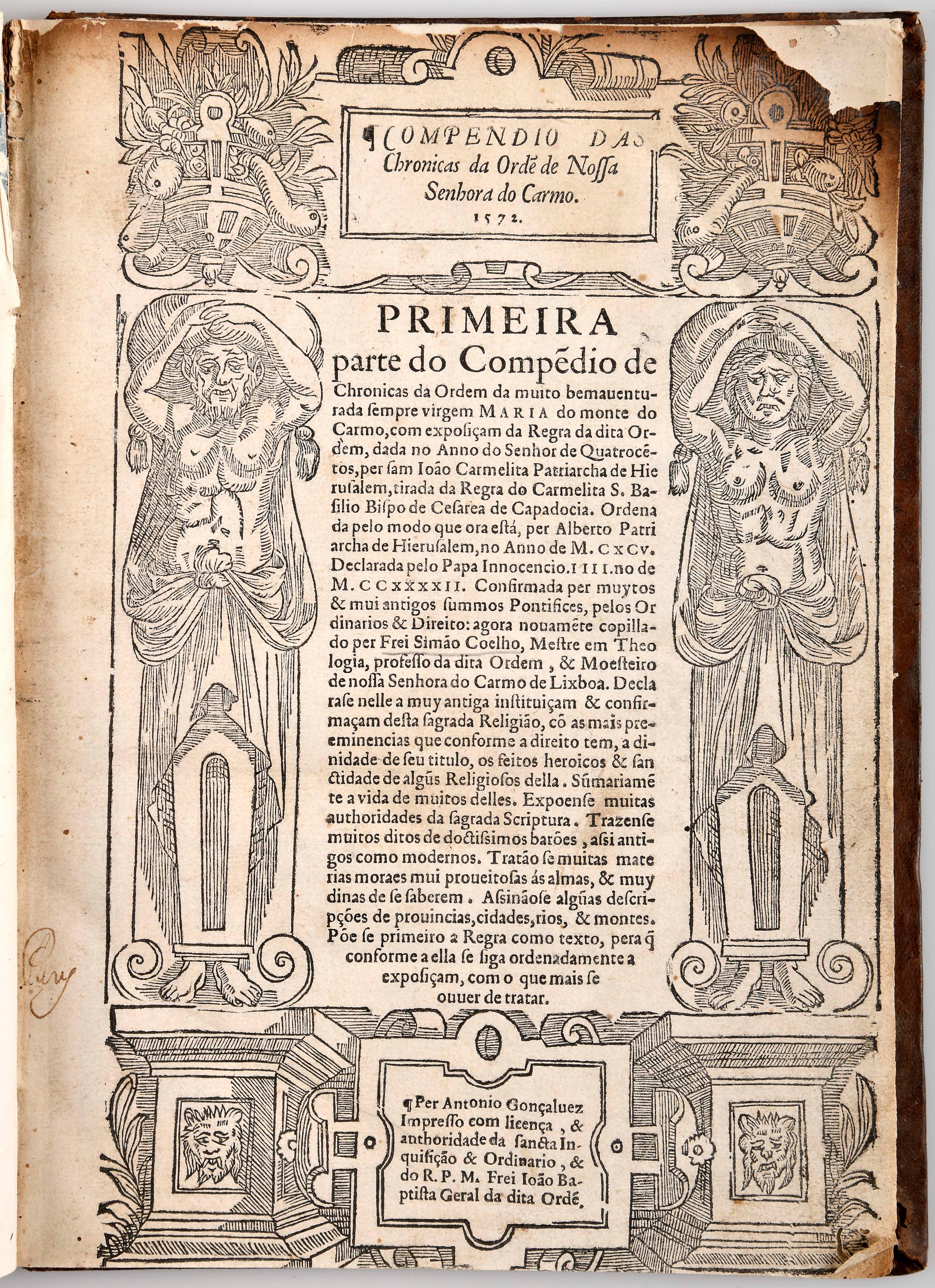 [ORDEM DE NOSSA SENHORA DO CARMO].- Compendio das Chronicas da Orde[m] de Nossa Senhora do Carmo. 1572. Primeira parte do Compe[n]dio de Chronicas da Ordem da muito bemauenturada sempre virgem Maria do monte do Carmo, com exposiçam da Regra da dita Ordem [...] Confirmada per muytos & mui antigos summos Pontifices, pelos Ordinarios & Direito: agora nouamëte copillado per Frei Simão Coelho, Mestre em Theologia, professo da dita Ordem, & Moesteiro de nossa Senhora do Carmo de Lixboa...- [Lisboa]: Per Antonio Gonçaluez, 1572.- [20], 220 p.: 1 gravura; 28 cm.- E. Única parte publicada das quatro que o autor terá deixado manuscritas. O compilador, Fr. Simão Coelho (1514-1606), estudou nas Universidades de Salamanca e de Siena; foi prior dos conventos e Moura e de Lisboa, tendo chegado a provincial da Ordem. O Pe. Balbino Velasco Bayon na sua História da Ordem do Carmo em Portugal (Lisboa, Paulinas, 2001) afirma ser esta a primeira obra impressa referente à história da Ordem do Carmo, um livro de grande erudição e uma verdadeira raridade bibliográfica. A edição apresenta um frontispício com quatro tarjas xilográficas, enquadrando um extenso sumário da obra, com o título tipografado, em cartela na traja superior. Segue-se uma gravura xilográfica de plena página e verso em branco, representando as armas da Ordem. Exemplar de trabalho, mas completo, muito aparado, com graves queimaduras (remendadas) nos cantos superiores externos de todo o volume, afectando ocasionalmente a mancha tipográfica, nomeadamente na folha de rosto. Carimbo da Casa de Azevedo na gravura (lote nº 787 do leilão realizado em 1921/22) e ex-libris de Victor d’Avila Perez (lote nº 1815 do leilão realizado em 1939/40); ambas as descrições já com os defeitos sumariamente descritos. Encadernação do século XIX, inteira de carneira, com imperfeições nos planos e lombada. Inocêncio, VII, p. 275 (conhecia apenas três exemplares, mas, aparentemente, desconhecia a gravura uma vez que não a menciona). Anselmo, 695. Biblioteca Nacional (Séc. XVI), 541. Biblioteca de D. Manuel II, 320.