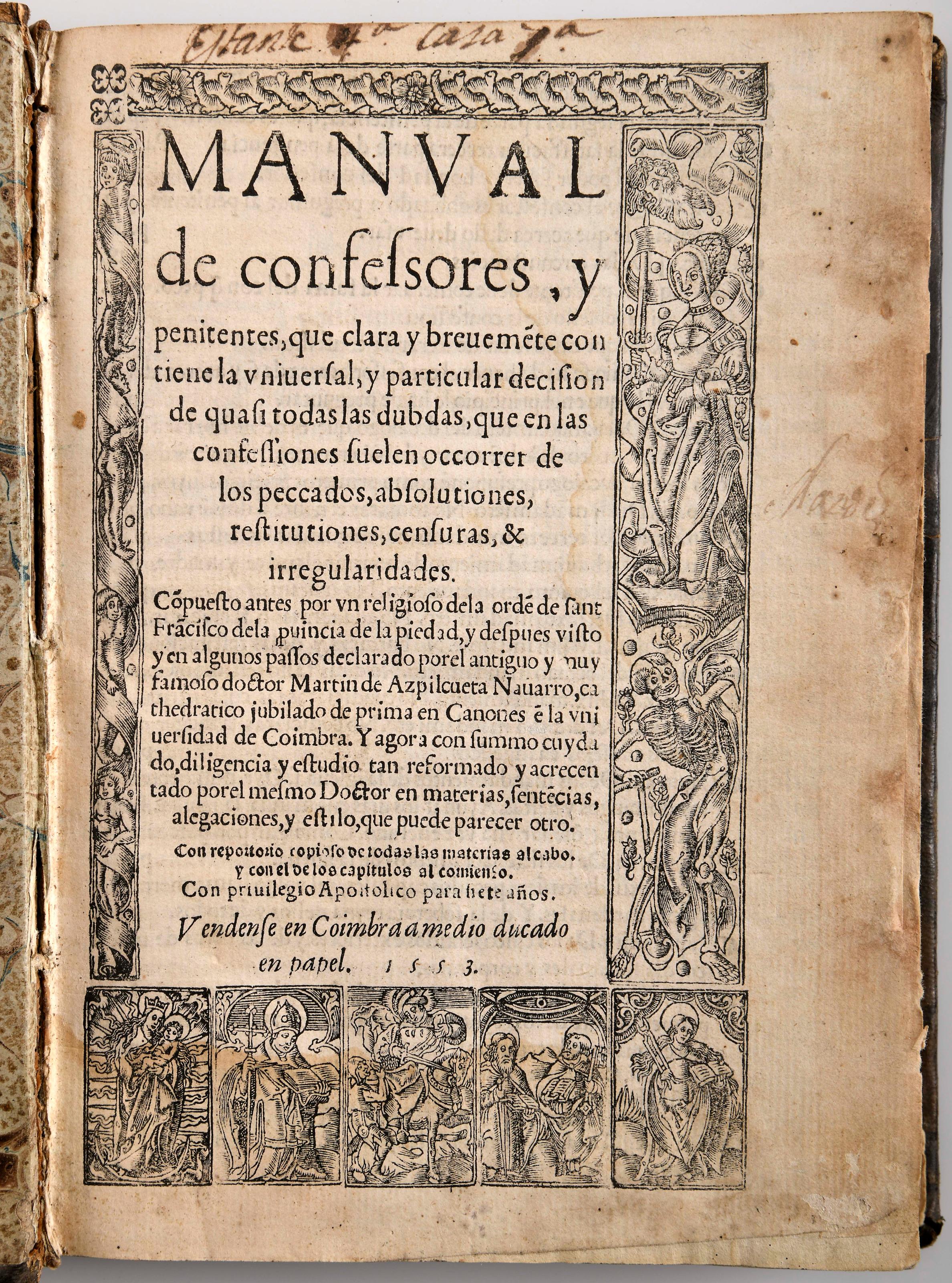 AZPILCUETA NAVARRO, Martin de, C.R.S.A. (1492-1586).- MANVAL | de confessores, y | penitentes, que clara y breueme[n]te con | tiene la vniuersal, y particular decision | de quasi todas las dubdas, que en las | confessiones suelen occorrer de | los pecados, absolutiones, | restitutiones, censuras, & | irregilaridades. | Cõpuesto antes por vn religioso de la orde[n] de sant | Frãcisco dela p[ro]uincia de la piedad, y despues visto | y en alguns passos declarado por el antiguo y muy | famoso doctor Martin Azpilcueta Nauarro...- In inclyta Conimbric:Ioannes Barrerius, et Ioannes Alvarez Regij Typographi excudebant. Anno Christo nato M. D. LIII. 1553.- [8], 564, [20] p.; 20 cm.- E. Primeira tradução portuguesa do “Manual de confessores” do humanista espanhol Martim de Azpilcueta (1492-1586), docente em Coimbra entre 1538 e 1554, sendo este o seu texto que atingiu maior popularidade com mais de 25 edições ainda durante o século XVI. Exemplar levemente aparado, sobretudo à cabeça, com algumas imperfeições, nomeadamente: primeiro caderno com manchas de fungos na margem externa, fragilizando o suporte, e margem inferior reconstruída; restauros marginais grosseiros nas últimas quatro folhas, que apresentam igualmente algumas manchas de humidade; inscrição antiga na margem superior do rosto (nota topográfica). Carimbo da Casa de Azevedo no verso da última folha preliminar (lote nº 2536 do catálogo do leilão realizado em 1921/22). Encadernação da século XIX, inteira de carneira, com patine pintada, com falta da primeira guarda volante. Anselmo, 296 (notícia extraída de Monteverde, 4251). Edição não referida nos principais catálogos e colecções consultados, nomeadamente na BNP e na Biblioteca de D. Manuel II.