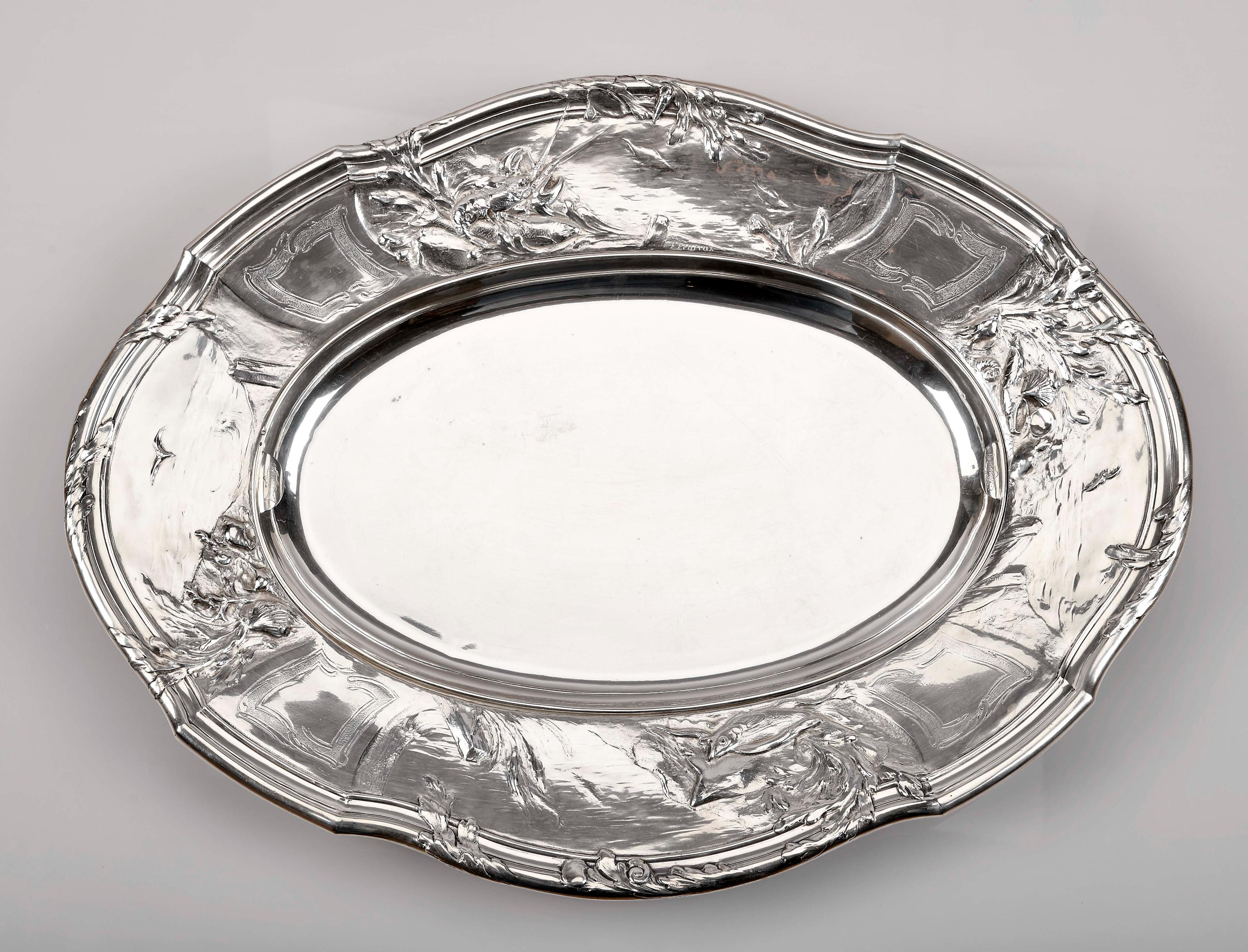 Travessa oval recortada com alma prata de 950/1000 aba com decoração relevada "Peixes, lagostas, conchas e algas", fundo com alma amovível Francesa pequenos defeitos, sinais de uso marcas de garantia de teor (1838-1972), marca de ourives Frédéric Boucheron (1830-1902), assinado F. PEUREUX - provavelmente Francis Peureux, sem marcas portuguesas, ao abrigo do Decreto-Lei nº 120/2017, de 15 de Setembro - art. 2º, nº 2, alínea c) Dimensões (altura x comprimento x largura) - 6,5 x 58 x 44 cm; Peso - 4.180 g.