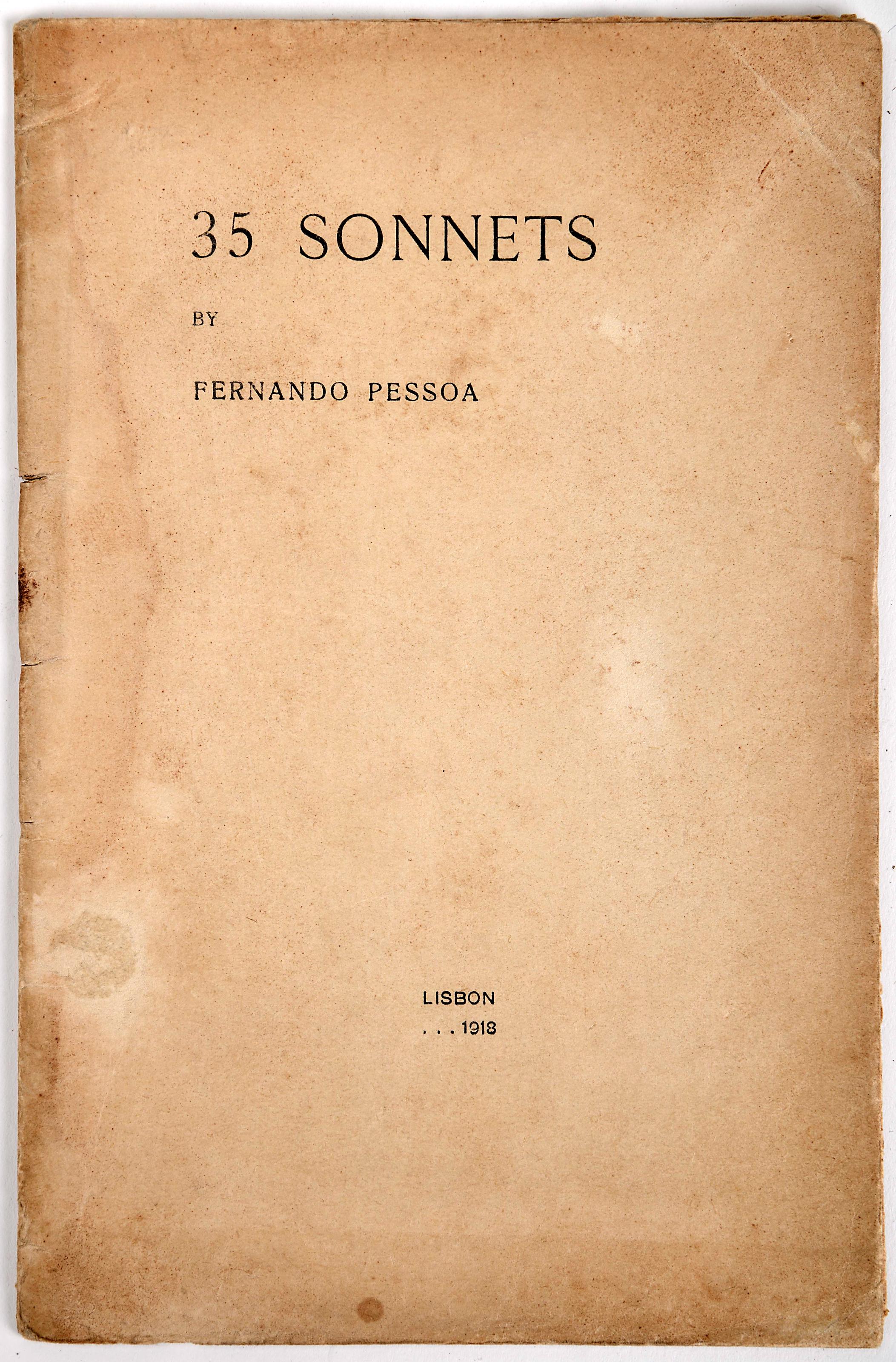 PESSOA, Fernando.- 35 sonnets.- Lisbon: Monteiro & Co., 1918.- [20] p.; 20 cm.- B. Excepcional exemplar de uma das primeiras publicações do autor em vida, com dedicatória autógrafa de Fernando Pessoa na página de rosto: Ao Augusto Ferreira Gomes, com um abraço do seu amigo Fernando Pessoa, Março. 1935. O dedicatário (1892-1953), jornalista e poeta, natural de Lisboa, foi um dos amigos mais chegados de FP e seu companheiro ocultista, também envolvido na célebre encenação que envolveu o desaparecimento de Aleister Crowley na Boca do Inferno; AFG foi também autor do livro de poemas Quinto Império (Lisboa, Parceria A.M. Pereira, 1934), para o qual FP escreveu um extenso prefácio (pág. XV a XXI), um dos três únicos prefácios e o último escrito pelo Poeta da Mensagem após os de Acrónios, de Luís Pedro e de Alma errante, de Eliezer Kamenezky, ambos publicados em 1932. O exemplar, muito limpo (apenas com uma minúscula mancha na margem inferior das primeiras quatro folhas), apresenta o ex-libris do Dr. Pedro Veiga, conhecido editor pessoano do Porto, colado no interior(?) da segunda capa de brochura.