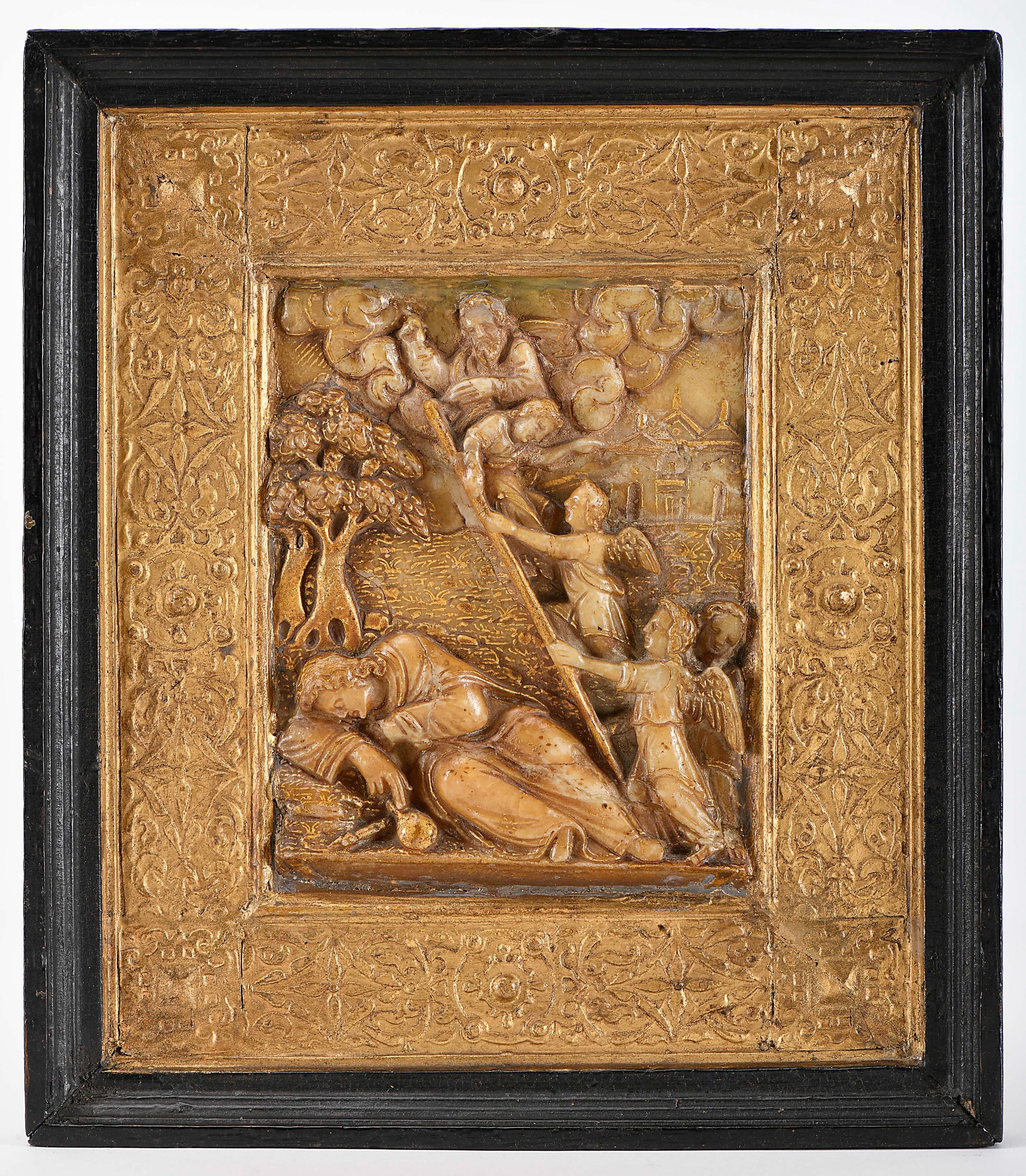 Sonho de Jacob Malines placa de alabastro esculpido moldura original em carvalho com relevos dourados Flamenga séc. XVI/XVII pequenos defeitos, restauro no dourado da moldura Dimensões (altura x comprimento x largura) - (placa) 12,5 x 10 cm; (total) 22,5 x 20,5 cm