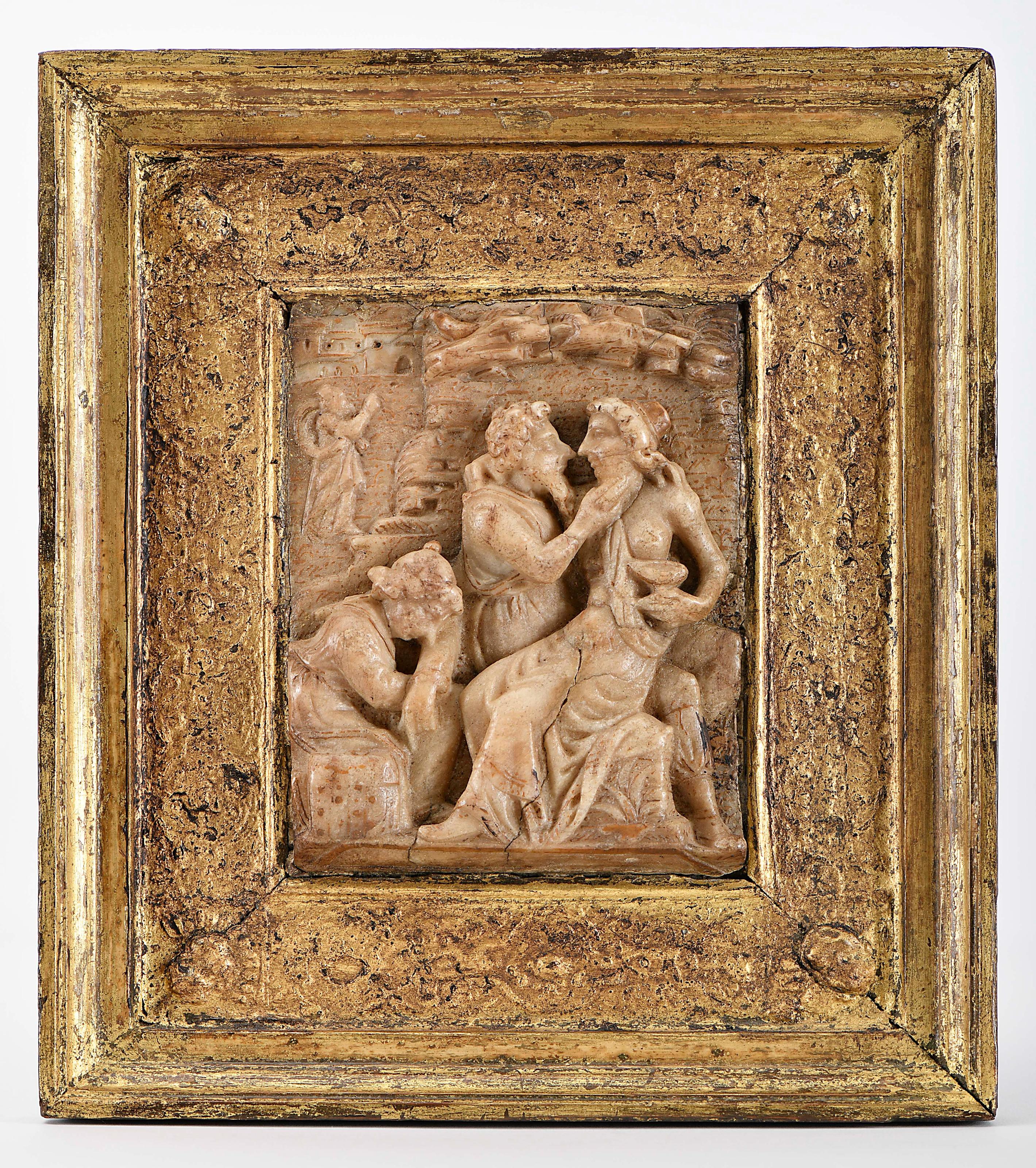 Ló e suas filhas após a destruição de Sodoma Malines placa de alabastro esculpido moldura original em carvalho com relevos dourados Flamenga séc. XVI/XVII pequenas faltas e fissuras no alabastro, pequenos defeitos na moldura e restauros no dourado Dimensões (altura x comprimento x largura) - (placa) 12,5 x 10 cm; (total) 22,5 x 20,5 cm