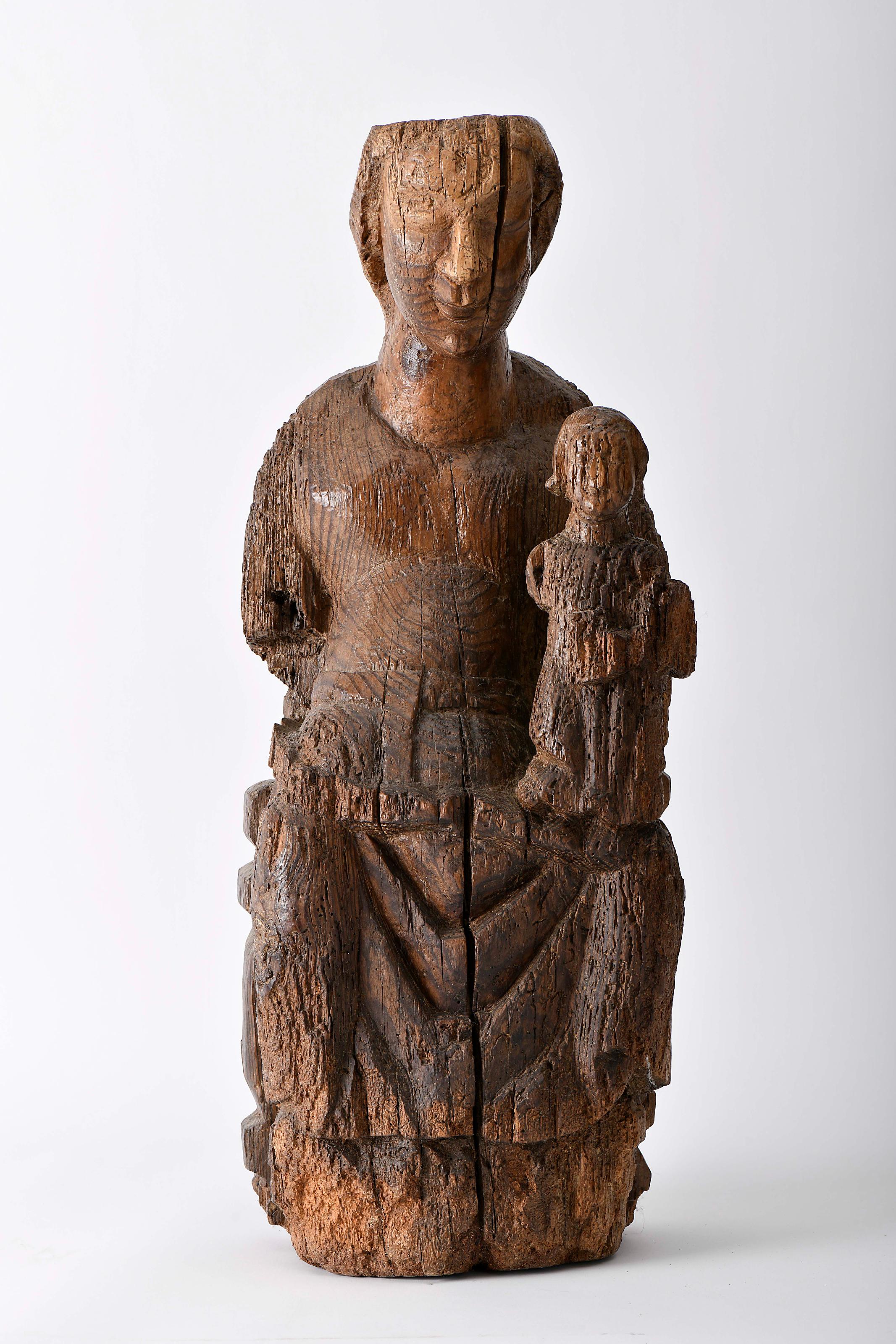 Nossa Senhora em Majestade com o Menino Jesus escultura gótica em casquinha Ibérica séc. XIV grande fissura na parte frontal, falta de braços, outras faltas, vestígios de insectos xilófagos Dimensões (altura x comprimento x largura) - 71,2 cm