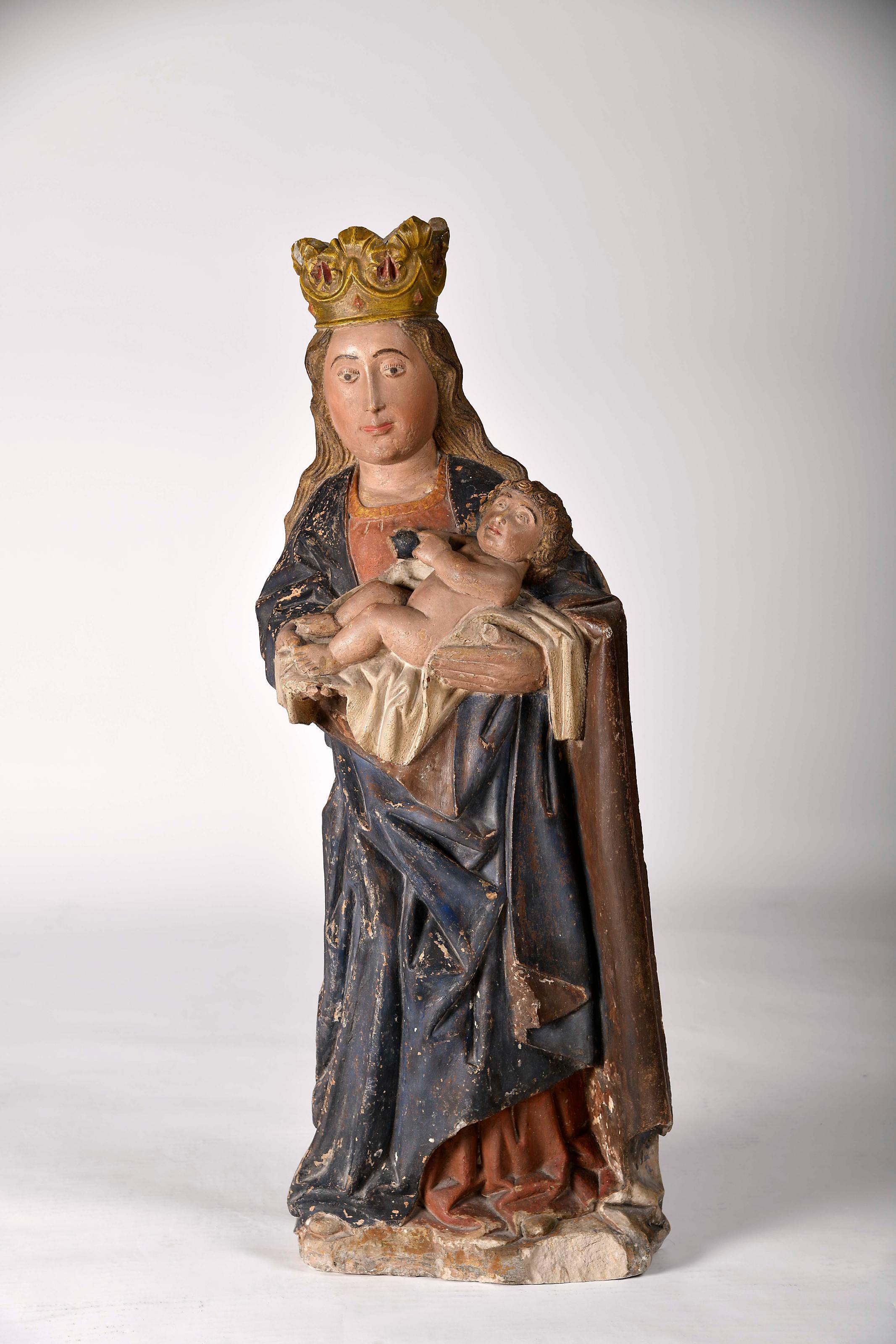 Nossa Senhora coroada com o Menino Jesus escultura tardo-gótica em pedra de Ançã pintada e dourada Portuguesa séc. XV/XVI restauros, falta de um dedo da mão de Nossa Senhora, falta na base, outras pequenas faltas e defeitos, faltas na decoração Dimensões (altura x comprimento x largura) - 99 cm Notas: vd. exemplar semelhante no catálogo da exposição do Museu Nacional de Arte Antiga "O Sentido das Imagens - Escultura e Arte em Portugal [1300-1500]". Lisboa: Instituto Português de Museus, p. 187, nº 103.