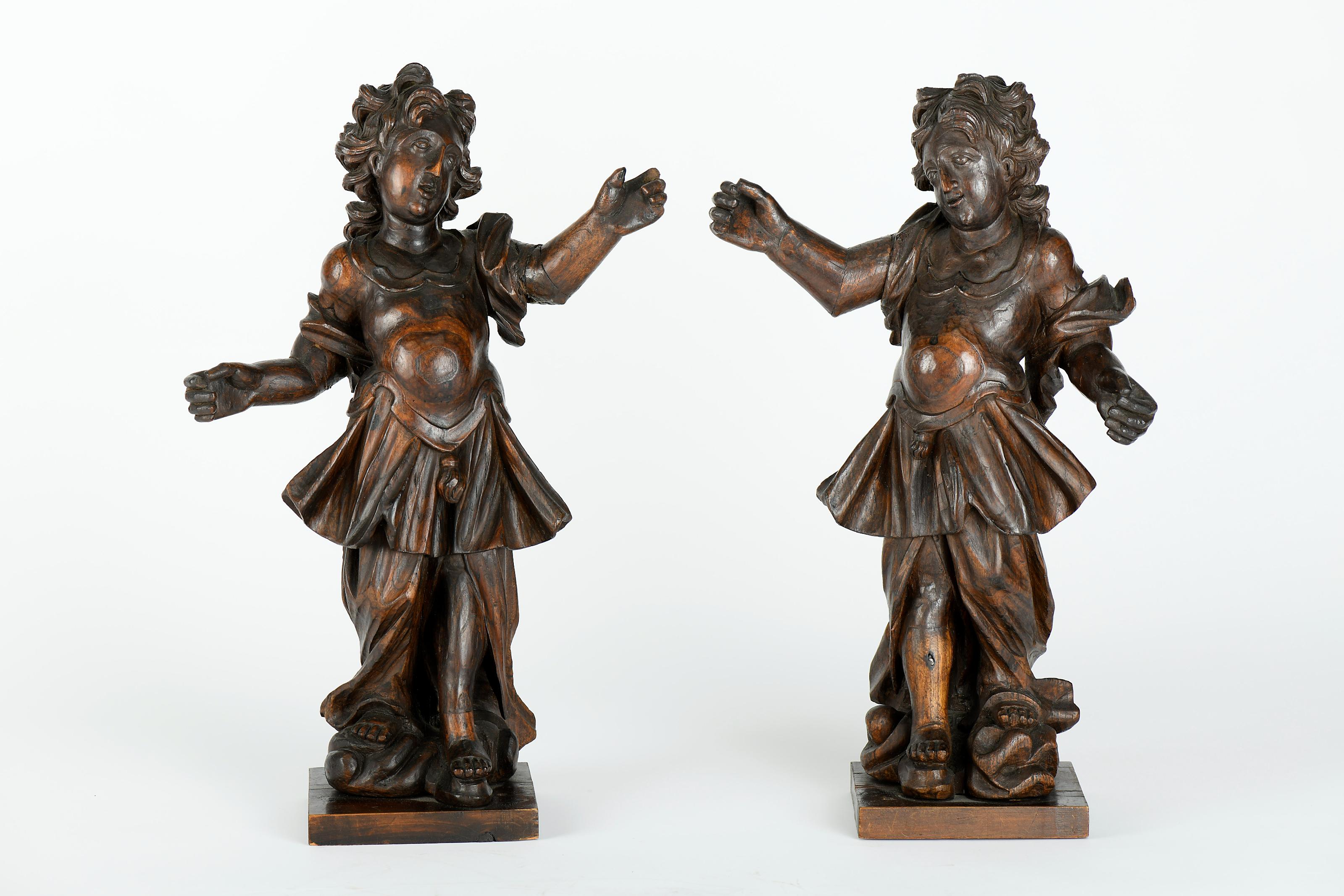 Serafins par de esculturas barrocas em castanho escurecido Portuguesas séc. XVIII (1ª metade) falta de um dedo, pequenos restauros, bases posteriores Dimensões (altura x comprimento x largura) - (total) 56 cm