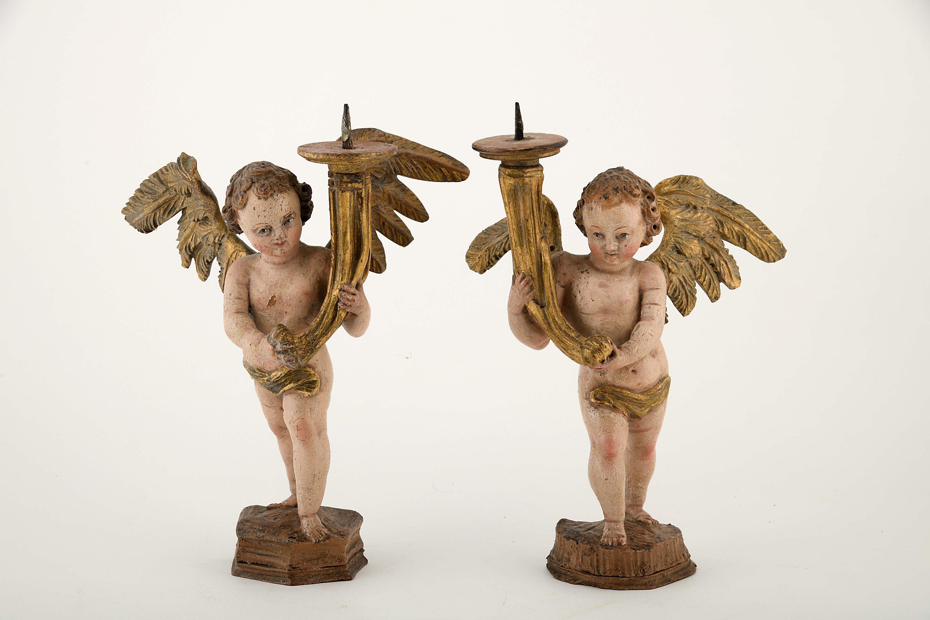 Anjos candelários par de esculturas barrocas em madeira dourada e policromada Portuguesas séc. XVIII (1ª metade) pequenas faltas e desgaste na policromia Dimensões (altura x comprimento x largura) - (total) 30,5 cm