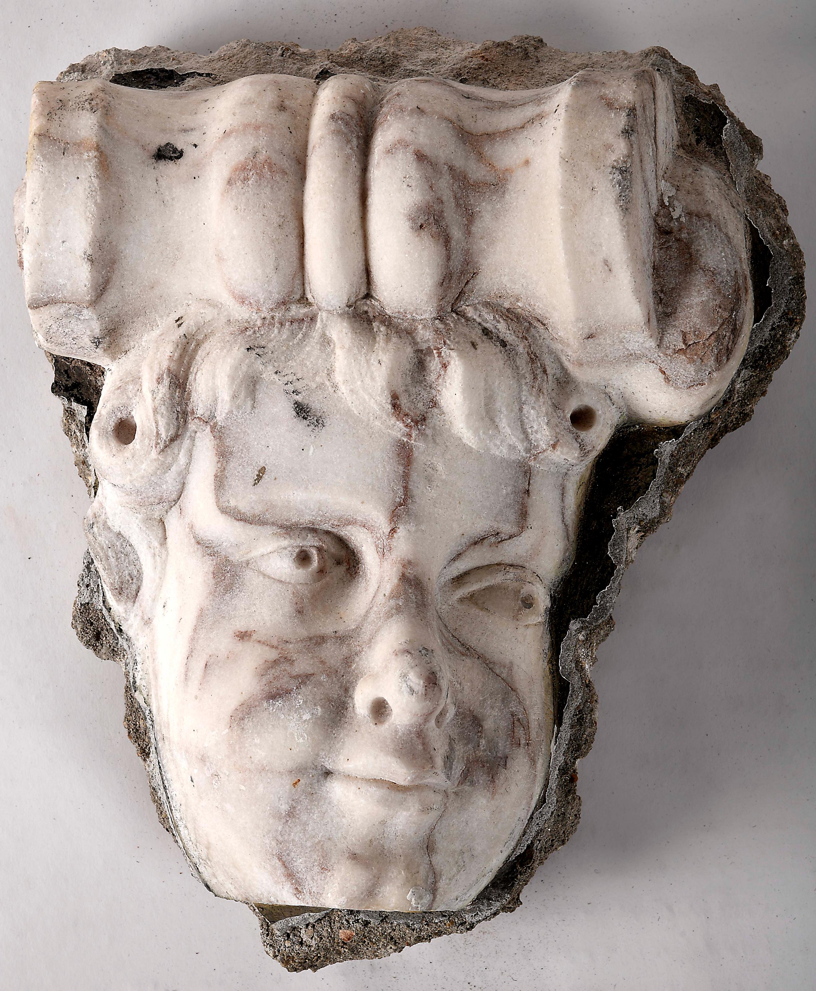 Cabeça de Anjo sob enrolamento escultura de relevo barroca em mármore Portuguesa séc. XVIII (1ª metade) pequenas faltas e defeitos, colocada sobre cimento Dimensões (altura x comprimento x largura) - (mármore) 25 x 22 x 5,5 cm