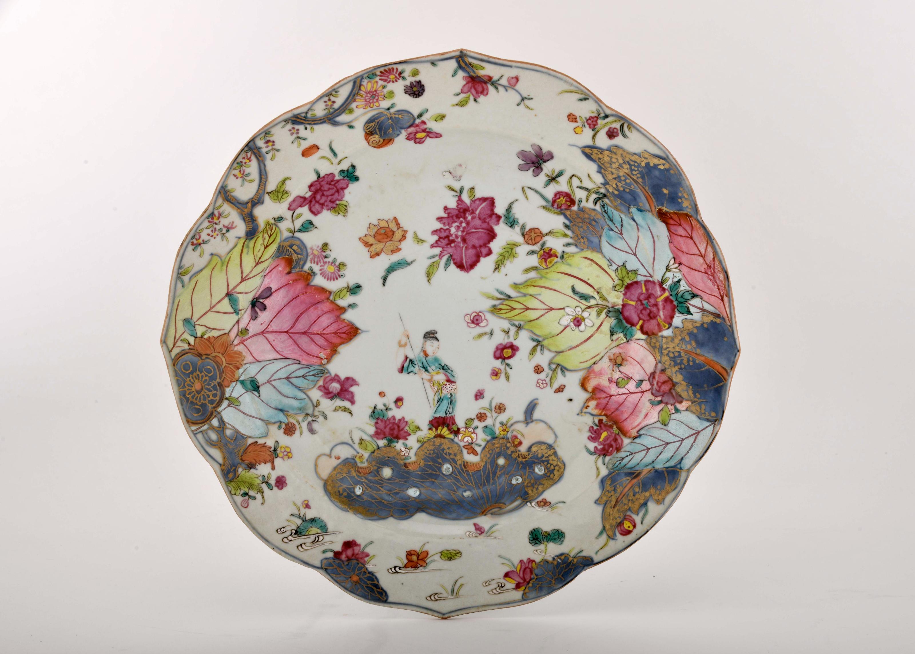 Prato recortado porcelana Chinesa de exportação decoração policromada e dourada "Folha de Tabaco com «Princesinha»" reinado Qianlong (1736-1795) pequenas esbeiçadelas no bordo Dimensões (altura x comprimento x largura) - 2,7 x 13,7 cm Notas: vd. DEBOMY, Pierre L. - "Tobacco Leaf and Pseudo/Feuille de Tabac et Pseudo - A Tentative Inventory/Tentative d'Inventaire". Sèvres: Société des Amis du Musée National de Céramique, 2013, pp. 114-115.