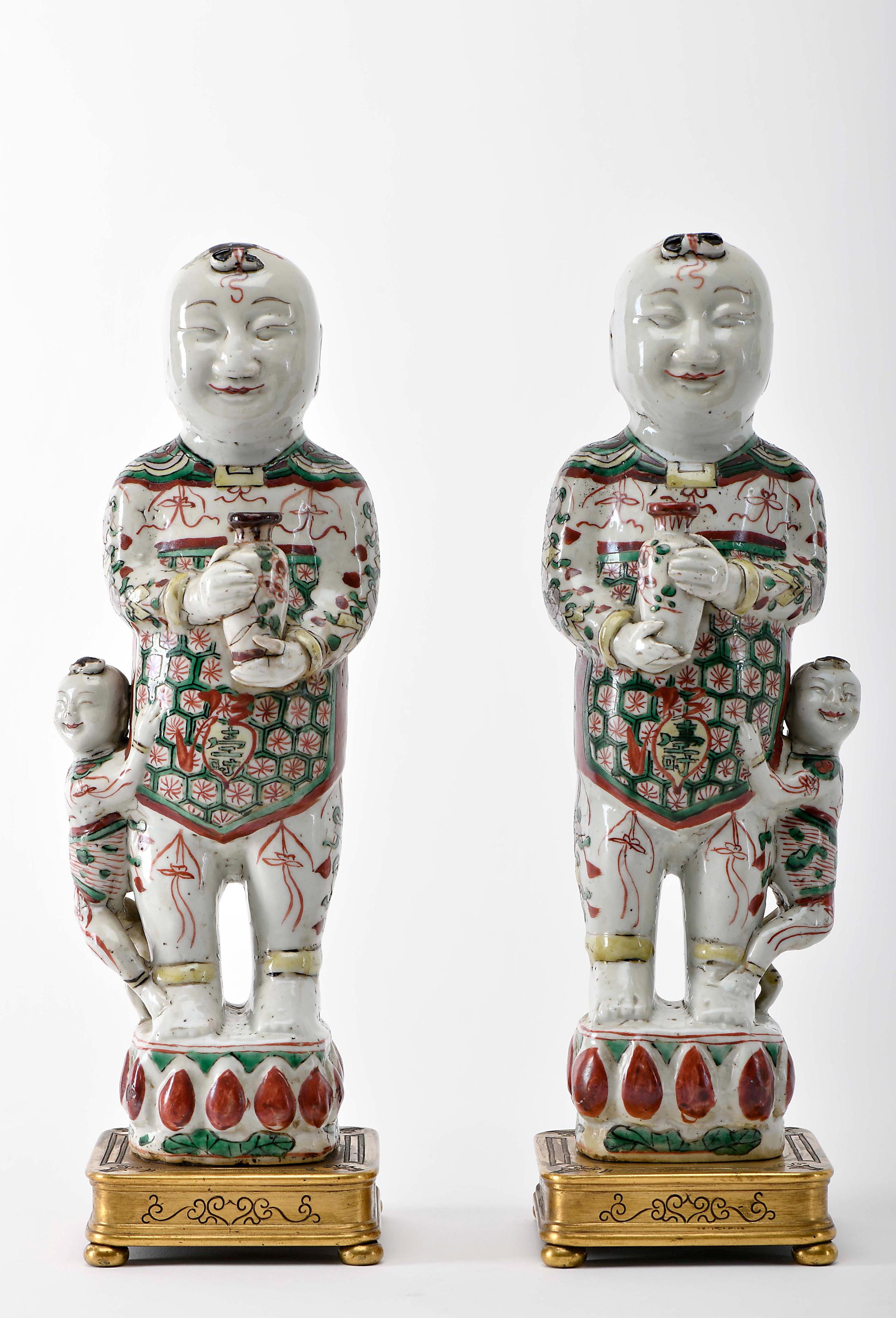 Laughing boys com crianças par de esculturas em porcelana Chinesa decoração «Família verde» policromada reinado Kangxi (1662-1722) uma com mão e vaso restaurados, faltas no vidrado, algum desgaste na decoração, bases posteriores em bronze Dimensões (altura x comprimento x largura) - 34 cm Notas: vd. ANTUNES, Mary Salgado Lobo - "Porcelanas". Lisboa: Fundação Ricardo do Espírito Santo Silva, 1999, p. 61, embora não apresentem as crianças.
