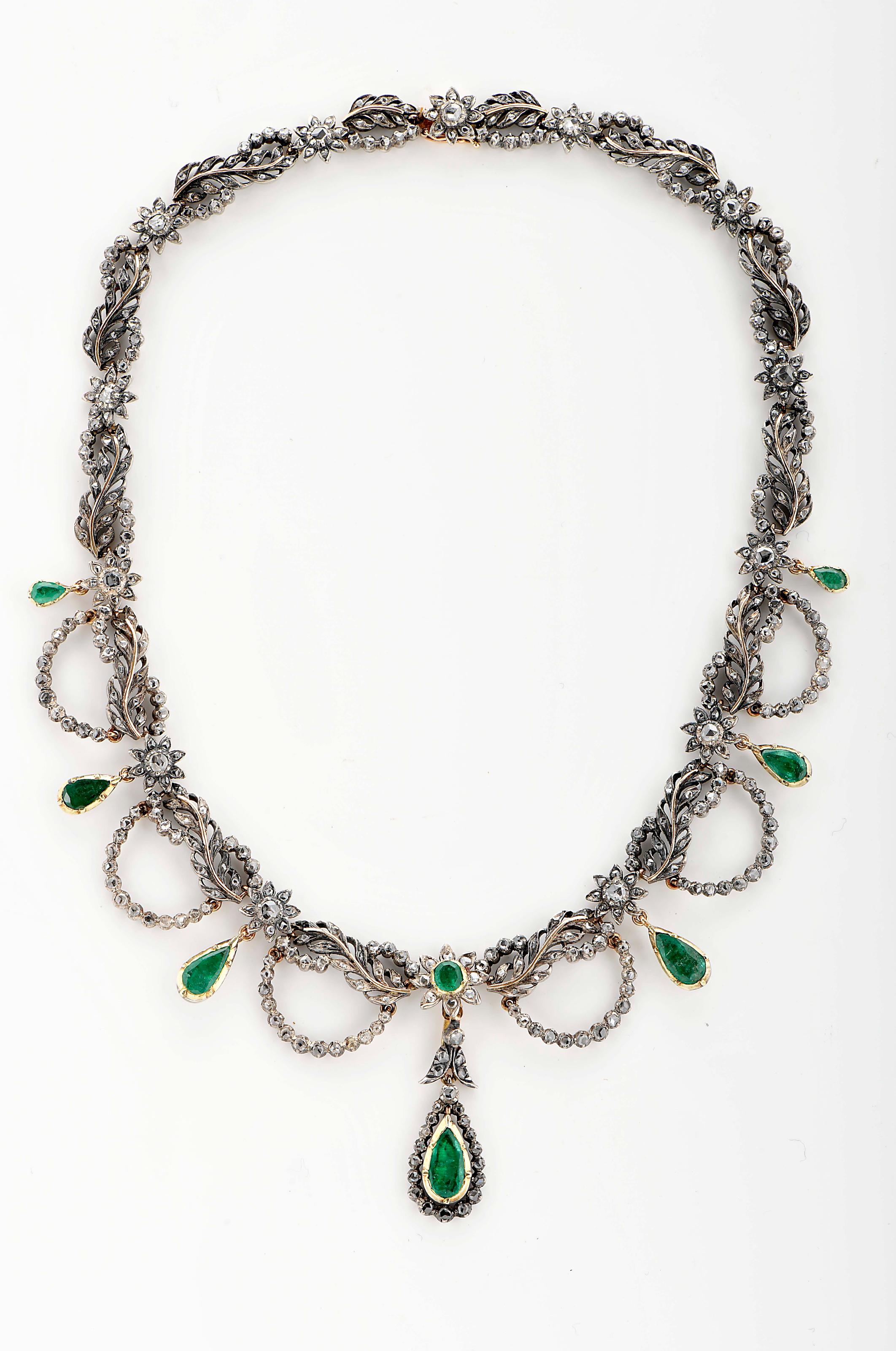 Colar prata de 833/1000 e ouro de 800/1000 cravejado com 7 esmeraldas em talhe gota e 1 em talhe octogonal todas forradas, diamantes em talhe rosa e talhe rosa coroado Português contraste do Porto (1938-1984), marca de ourives de Alexandre Pinto da Silva (reg. 1919) Dimensões (altura x comprimento x largura) - 42,5 cm; Peso - 71 g. Notas: vd. VIDAL, Manuel Gonçalves; ALMEIDA, Fernando Moitinho de - "Marcas de Contrastes e Ourives Portugueses (1887 a 1993)", vol. II. Lisboa: IN-CM, 1996, nº 98, 110 e 1122.